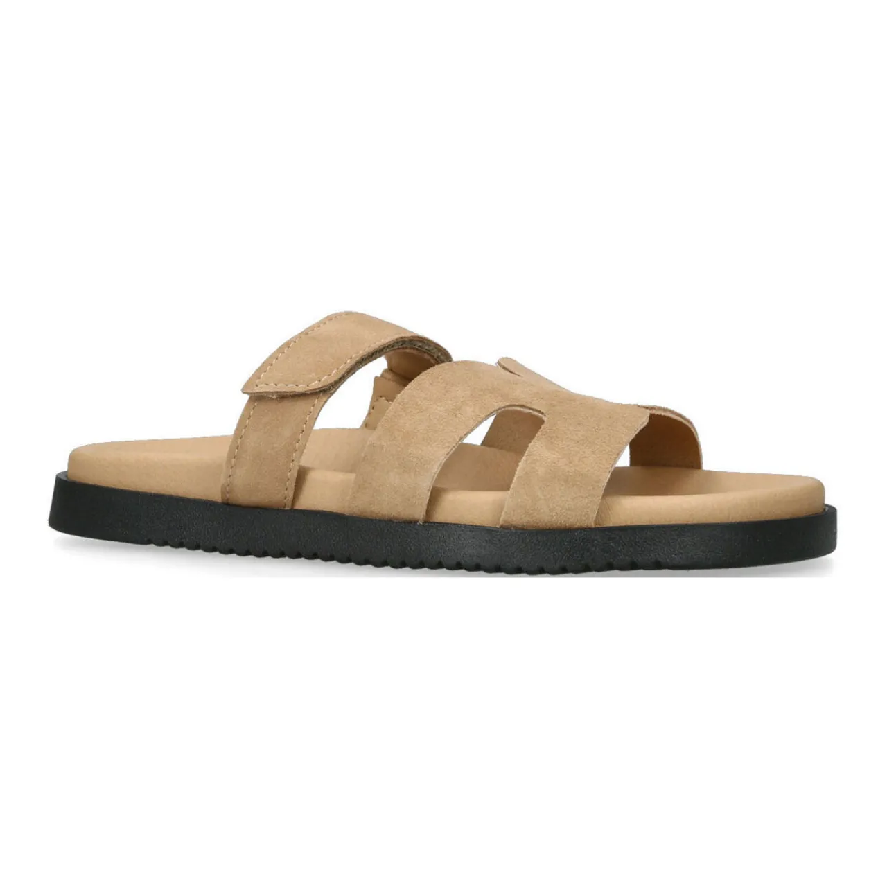 - Flat sole, slip-on style, backless silhouette, round open toe, multiple foot straps, suede upper, tape and loop fastening strap