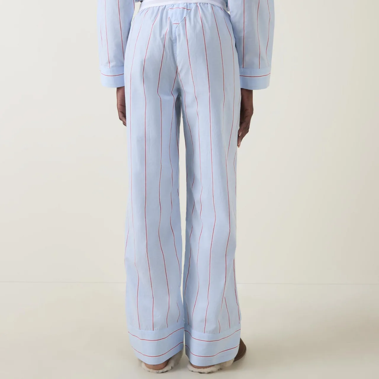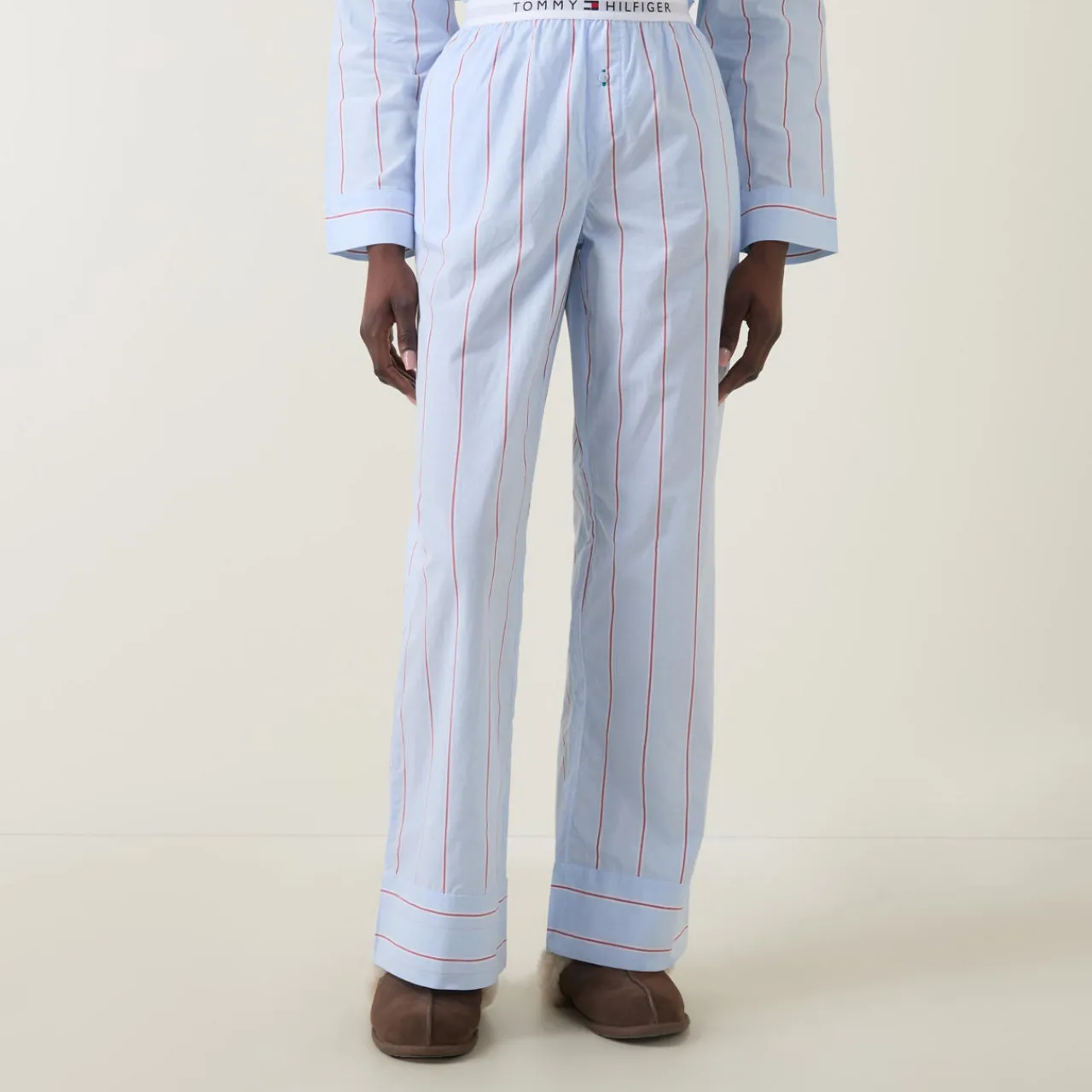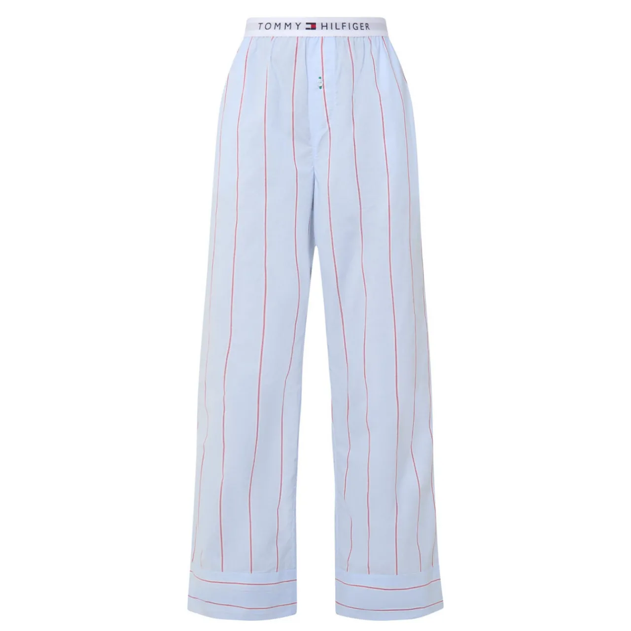 - High-rise, straight leg, elasticated logo waistband, faux button fly, two side seam pockets, clean hems, striped design, branding throughout, breathable fabric
