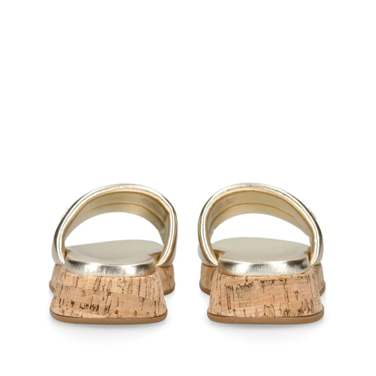 - Round open toe, wide foot strap, cork-effect sole, slip-on style, logo hardware
