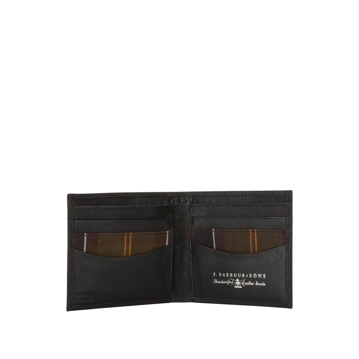 - Billfold design, silver-tone foil detailing, embossed logo detailing, textured leather finish, tartan lined
