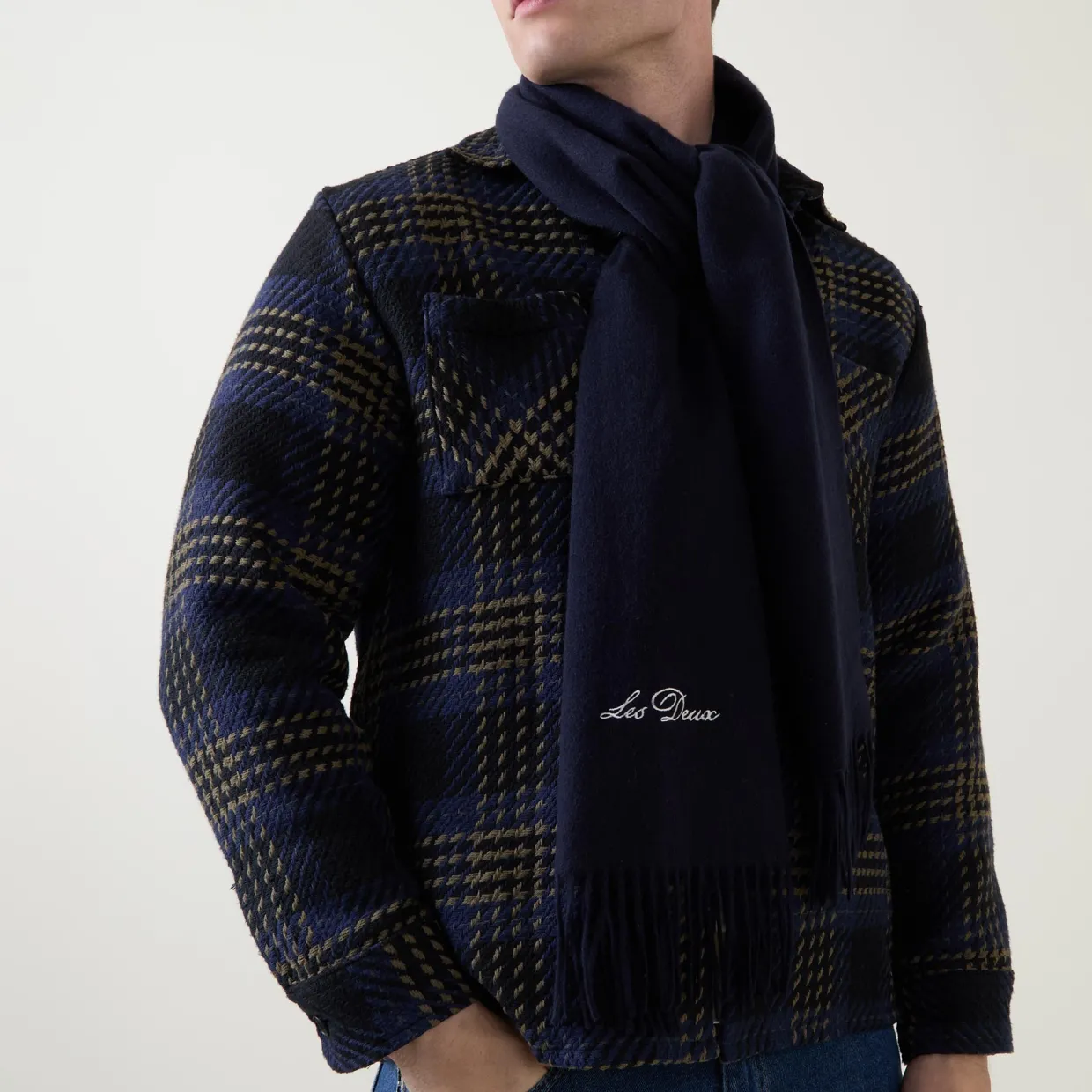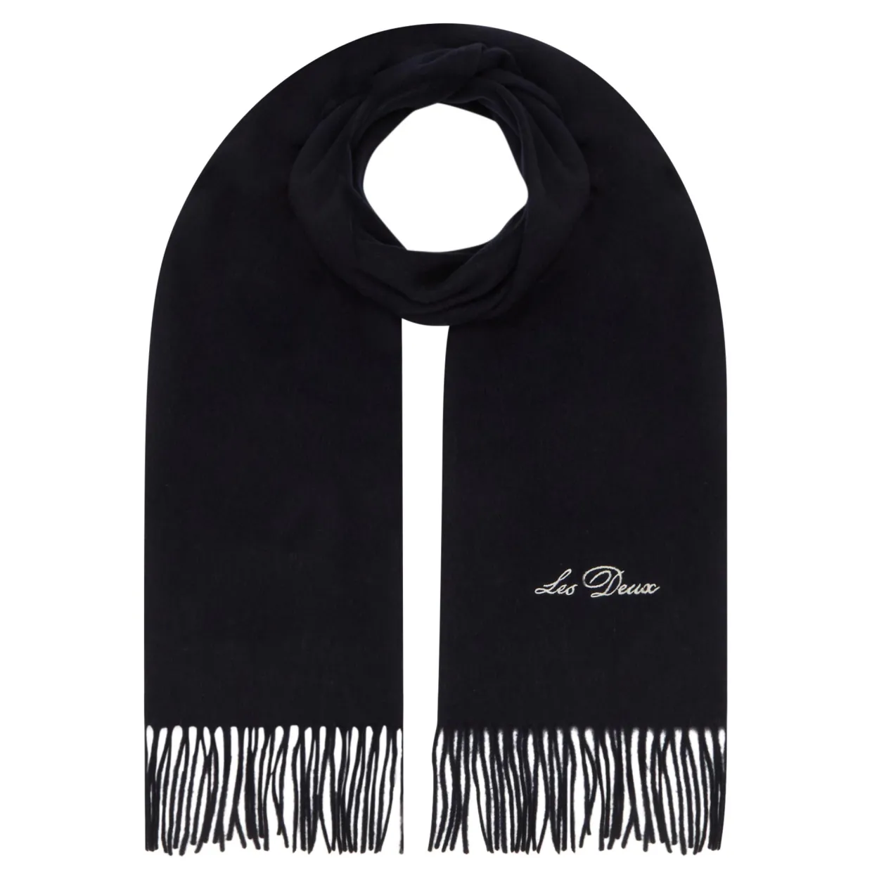 - Wrap-around design, fringed edges, contrast logo embroidery, soft finish