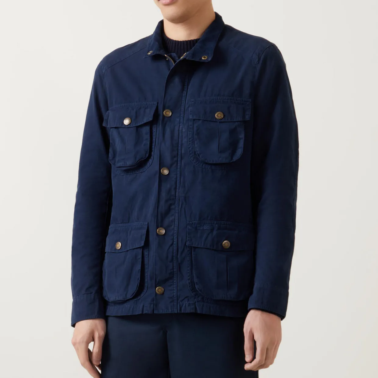 - Stand collar, long sleeves, adjustable snap-button cuffs, front zip fastening with snap-button placket, four front flap pockets with snap-button fastenings, two side slit pockets, straight hem, rear embroidered logo detail, lightweight