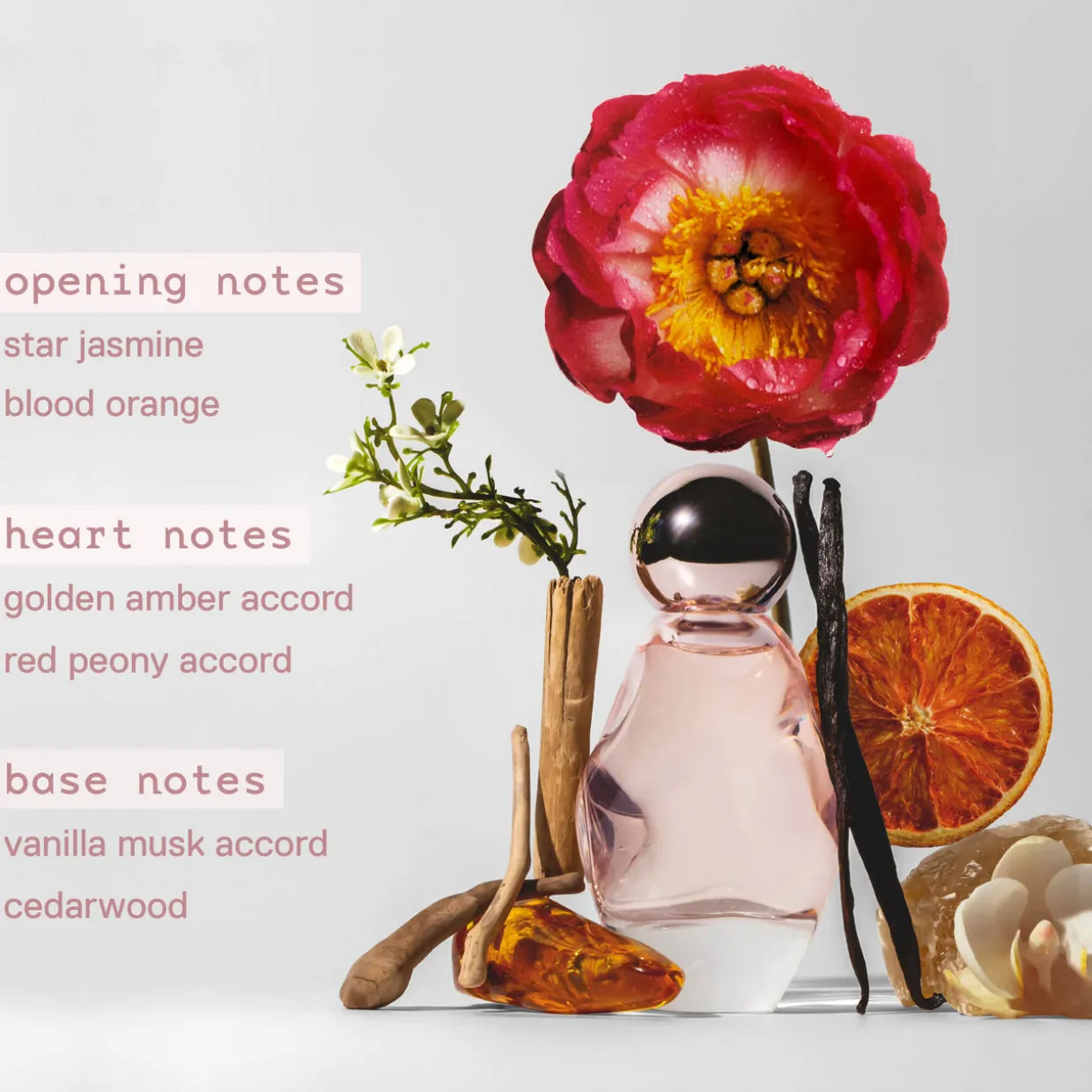 - Top Notes: Star jasmine, blood orange. Heart Notes: Golden amber accord, red peony accord. Base Notes: Vanilla musk accord, cedarwood