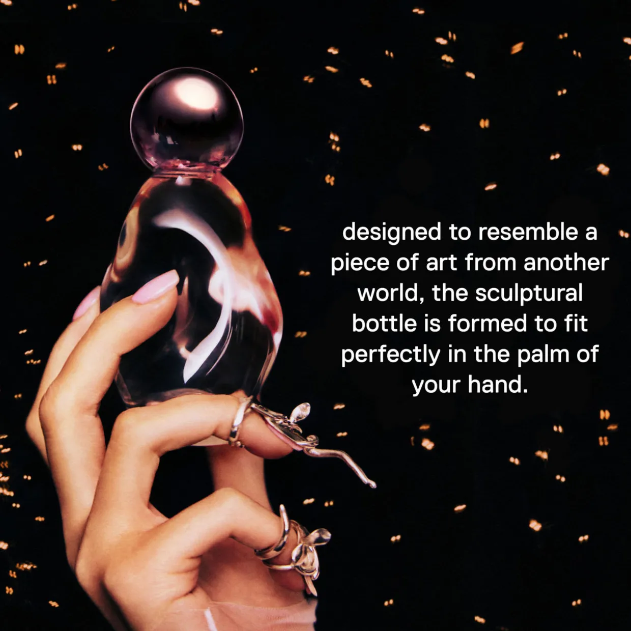 Cosmic Kylie Jenner is designed to resemble a piece of art from another world, the sculptural bottle formed to fit perfectly in the palm of your hand. Different from every angle, the unique shape represents the ever-changing nature of love, and the mirrored cap is present to reflect your image and remind you to show yourself love and grace.