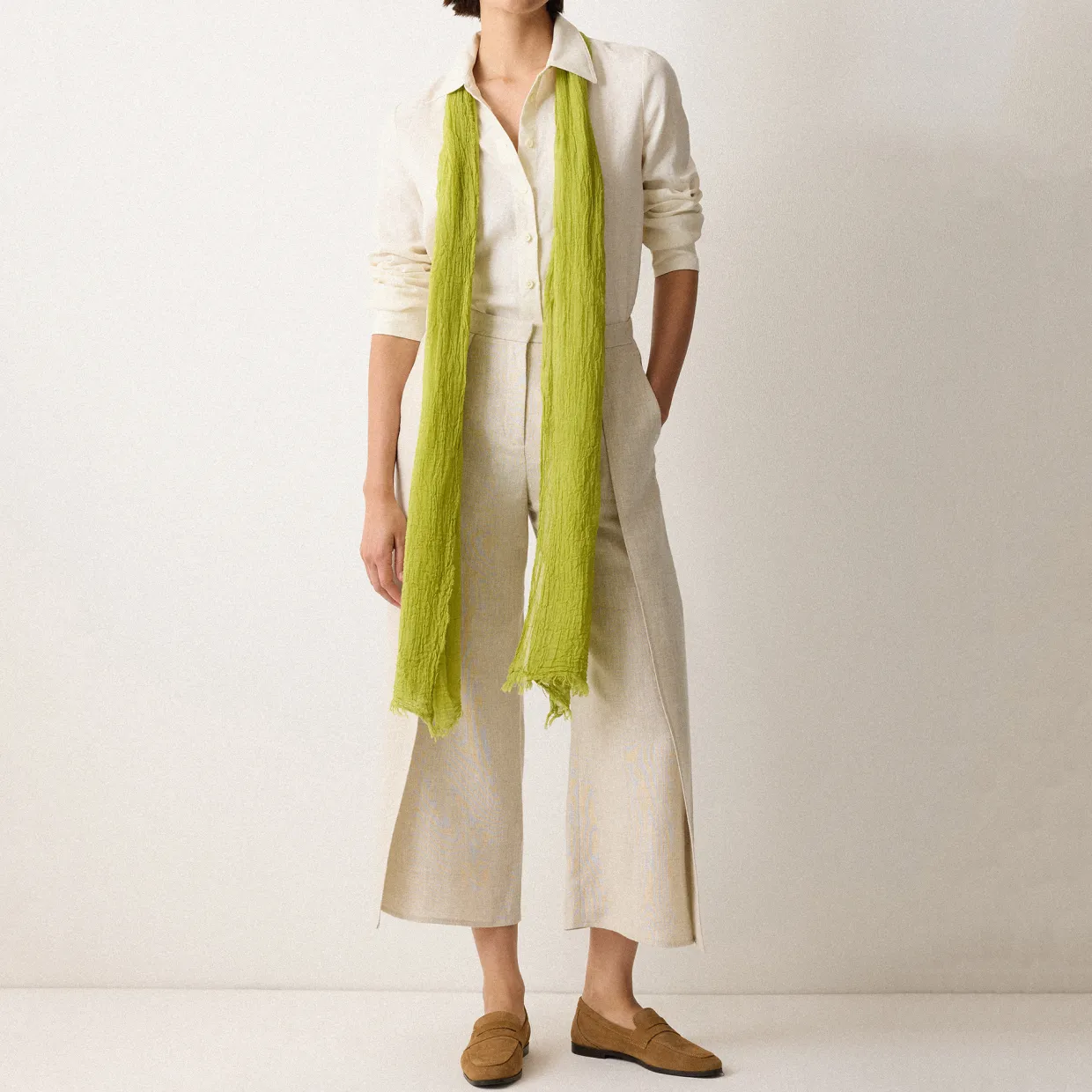 - Oblong-shaped, solid design, crinkled woven finish, frayed edges, lightweight