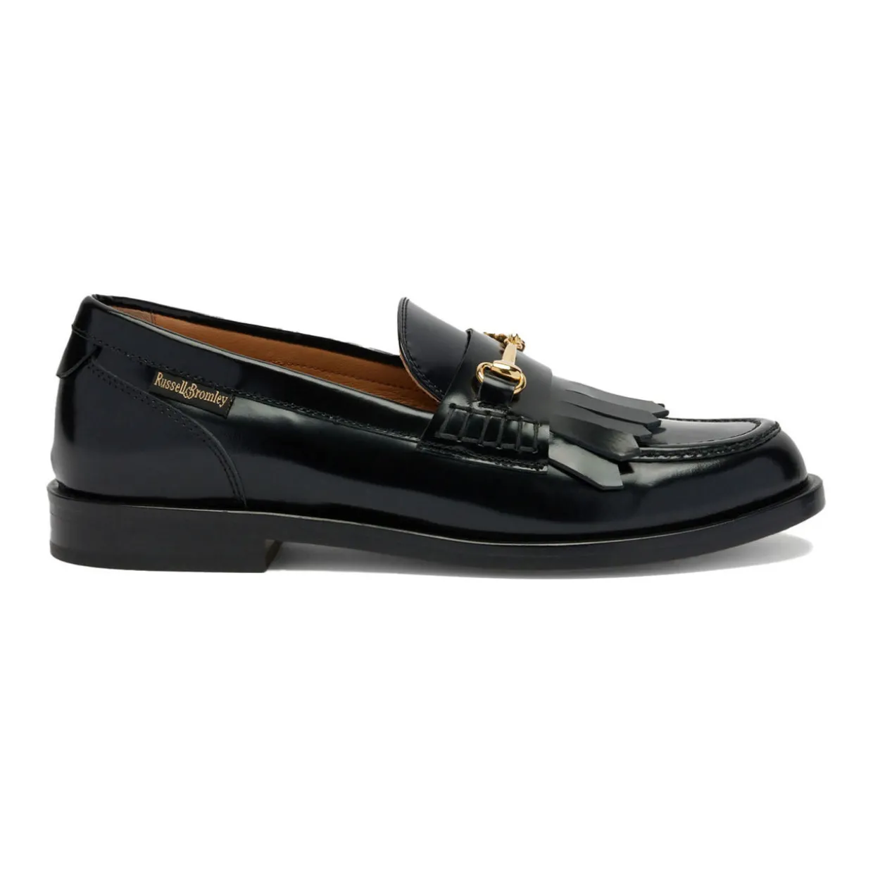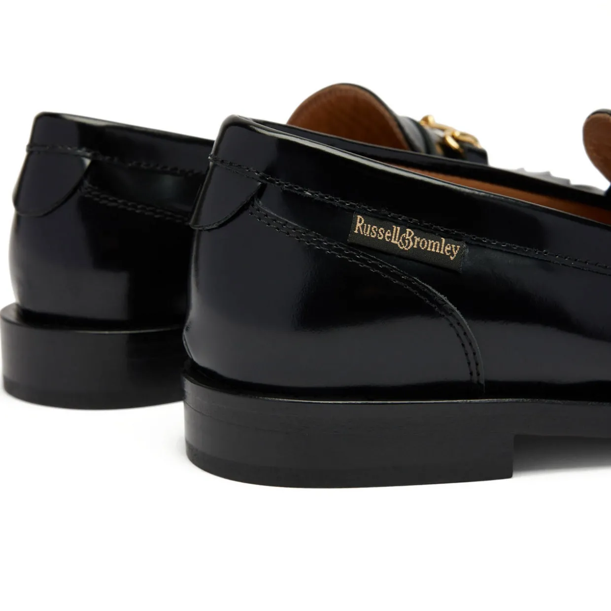 - Classic fringed detailing with a bold gold snaffle trim, high shine patent leather
