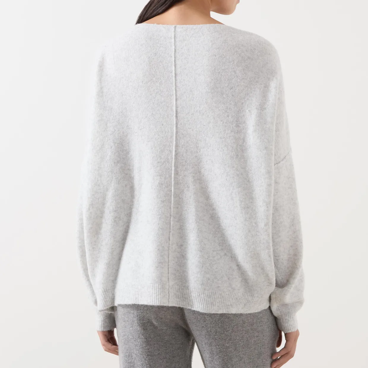 - Boat neckline, long sleeves, dropped shoulders, ribbed trims