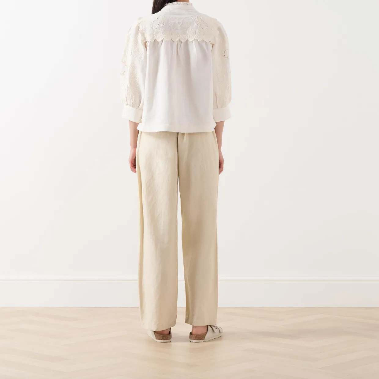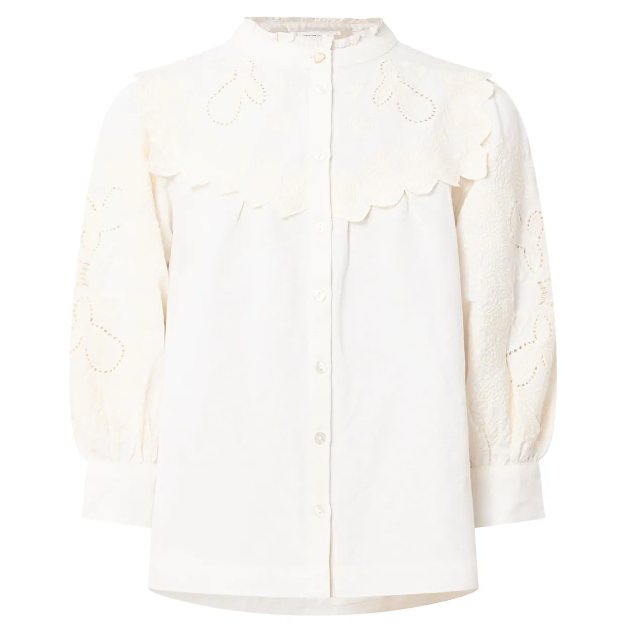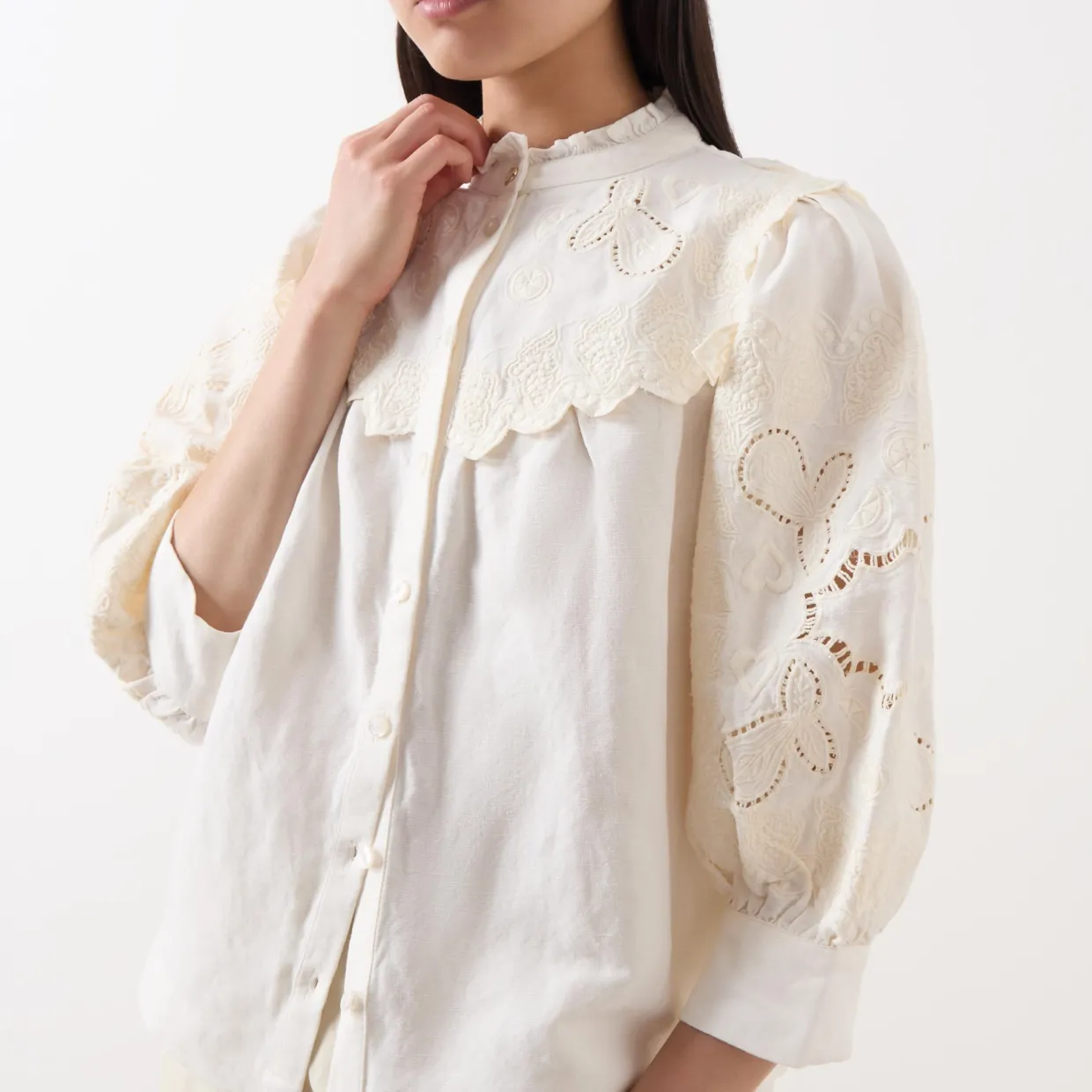 - Embroidered detail, ruffled neckline, long sleeves, button fastenings, curved hemline