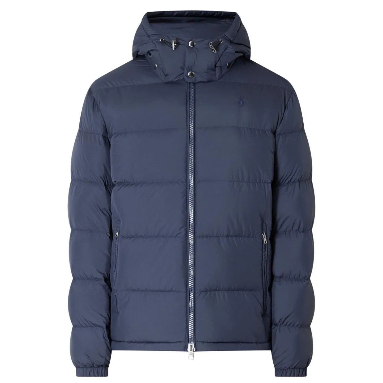 - Detachable hood with snap button fastening, padded collar, long sleeves, elasticated cuffs, front zip fastening, two side pockets with zip fastenings, straight hem, embroidered logo on the chest, padded
