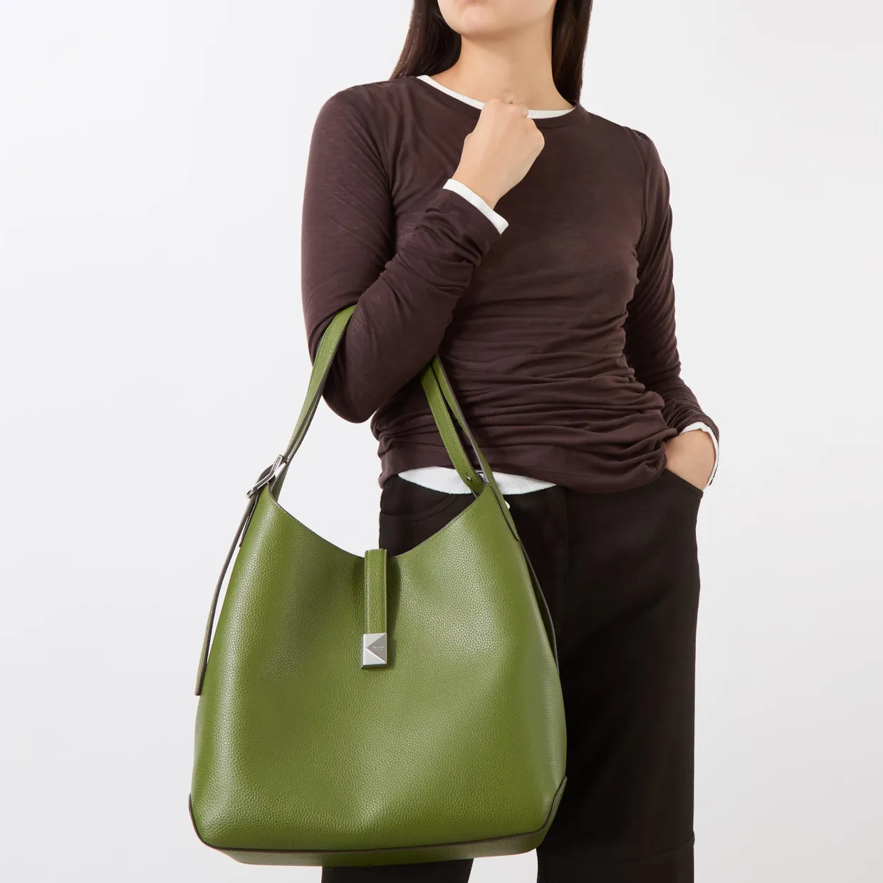 - Adjustable shoulder straps, open top with tab closure, silver-tone hardware, logo details, curved base, grained finish