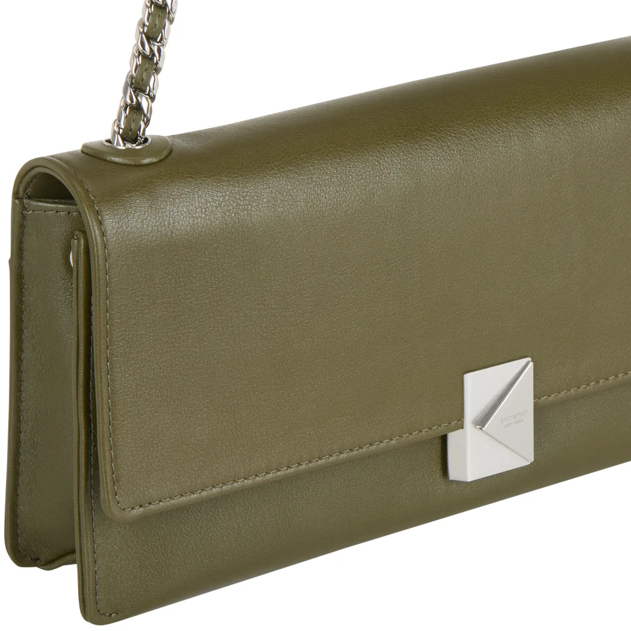 - Foldover flap closure, snap fastening, chain link crossbody strap, back slip pocket, silver-tone hardware, tonal stitching, smooth leather finish