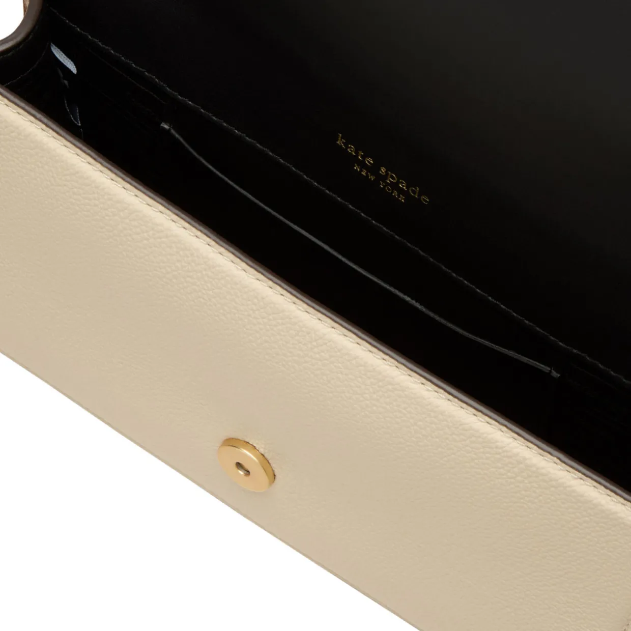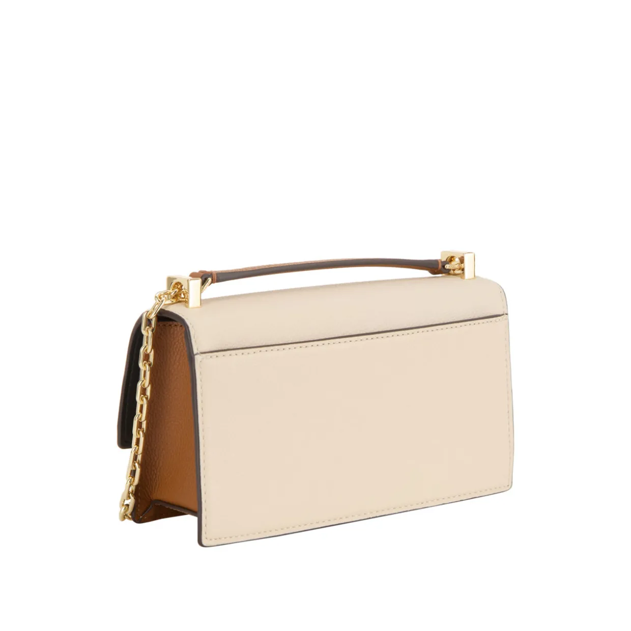 - Flap fastening with snap button closure, adjustable chain strap, gold-tone hardware, logo details, interior slip pocket