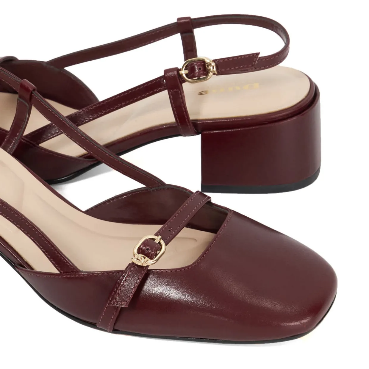 - Slingback courts, squared off toe, gold-tone branded buckle on the front strap, adjustable ankle strap, block midi heel, branded sole, cushioning