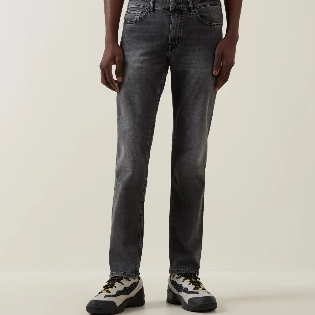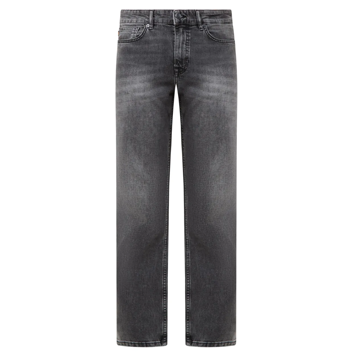 - Button and fly zip fastening, belt loops, five-pocket style, wide-cut legs, faded and whiskering details
