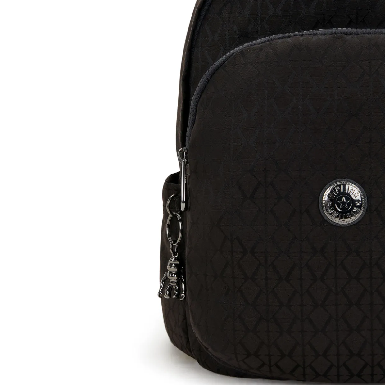 Features: Zipped main compartment, water repellent, two zipped front pockets, one zipped inside pocket, three functional compartments (one wallet and two pen), two elasticated side pockets, adjustable backpack straps, top handle, key fob