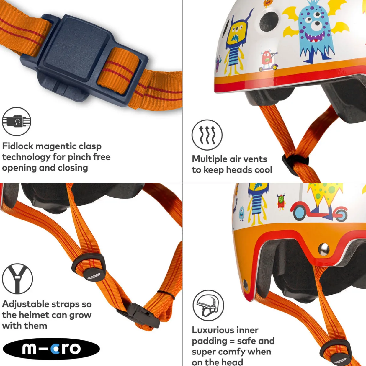 - Rear flashing light, easy fastening chin strap, adjustable chin strap, air vents, extra padding, logo, monster print design