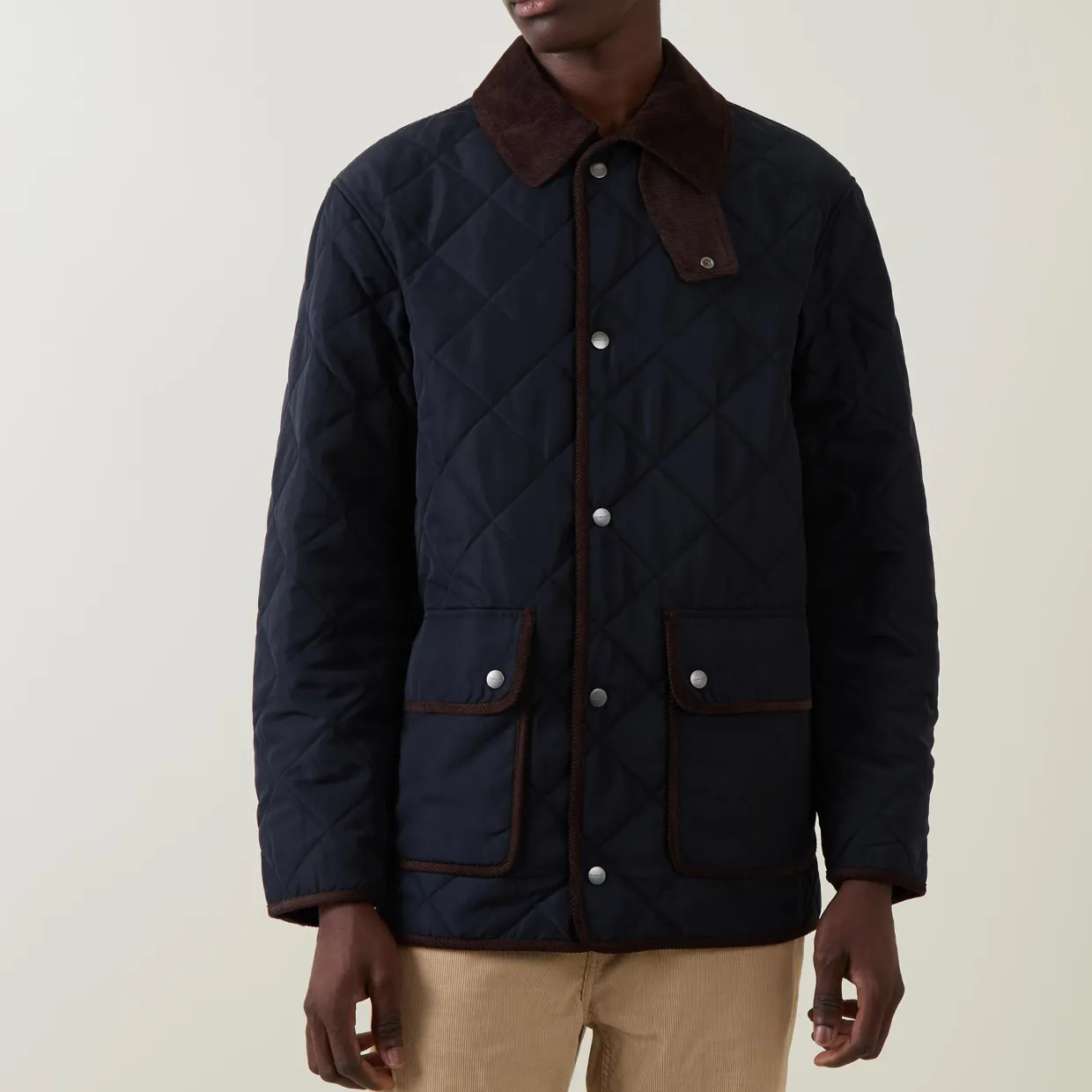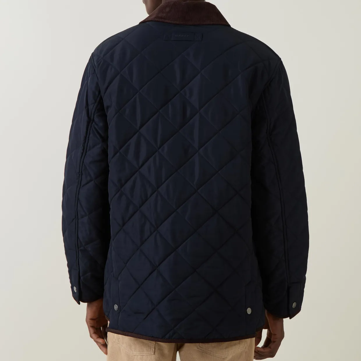 - Snap button fastening, contrast flat collar and throat guard, diamond quilted, long sleeves, buttoned cuffs, tab adjustable hemline, patch pockets, logo details