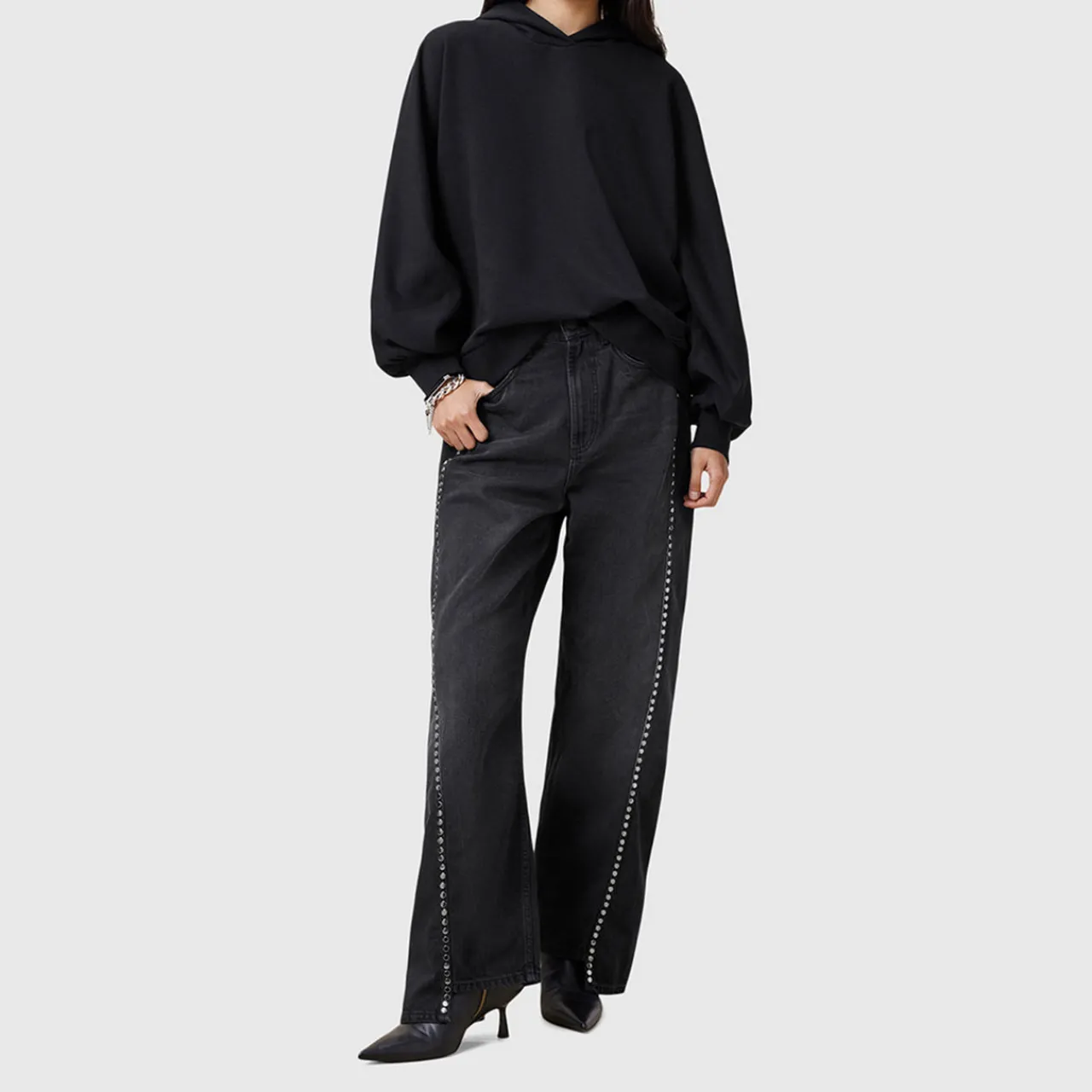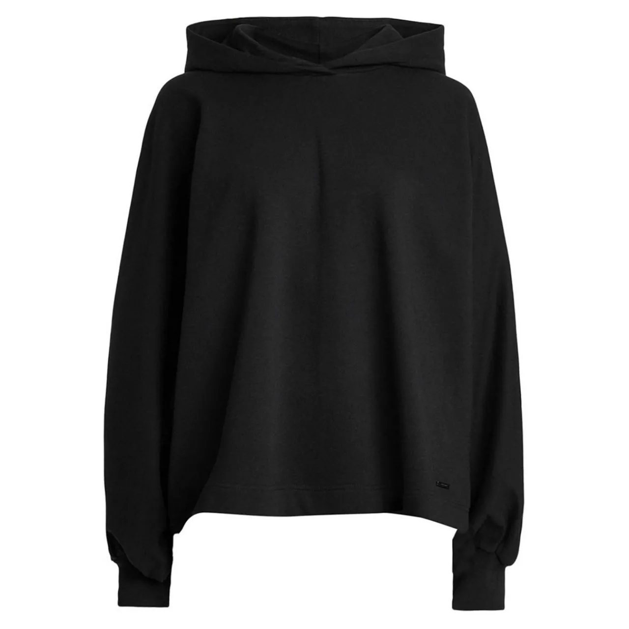 - Long batwing sleeves shape, draped silhouette, hood, pull-on style