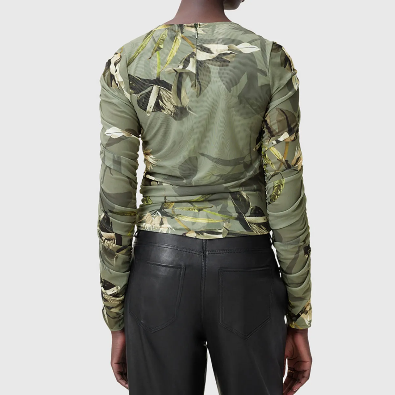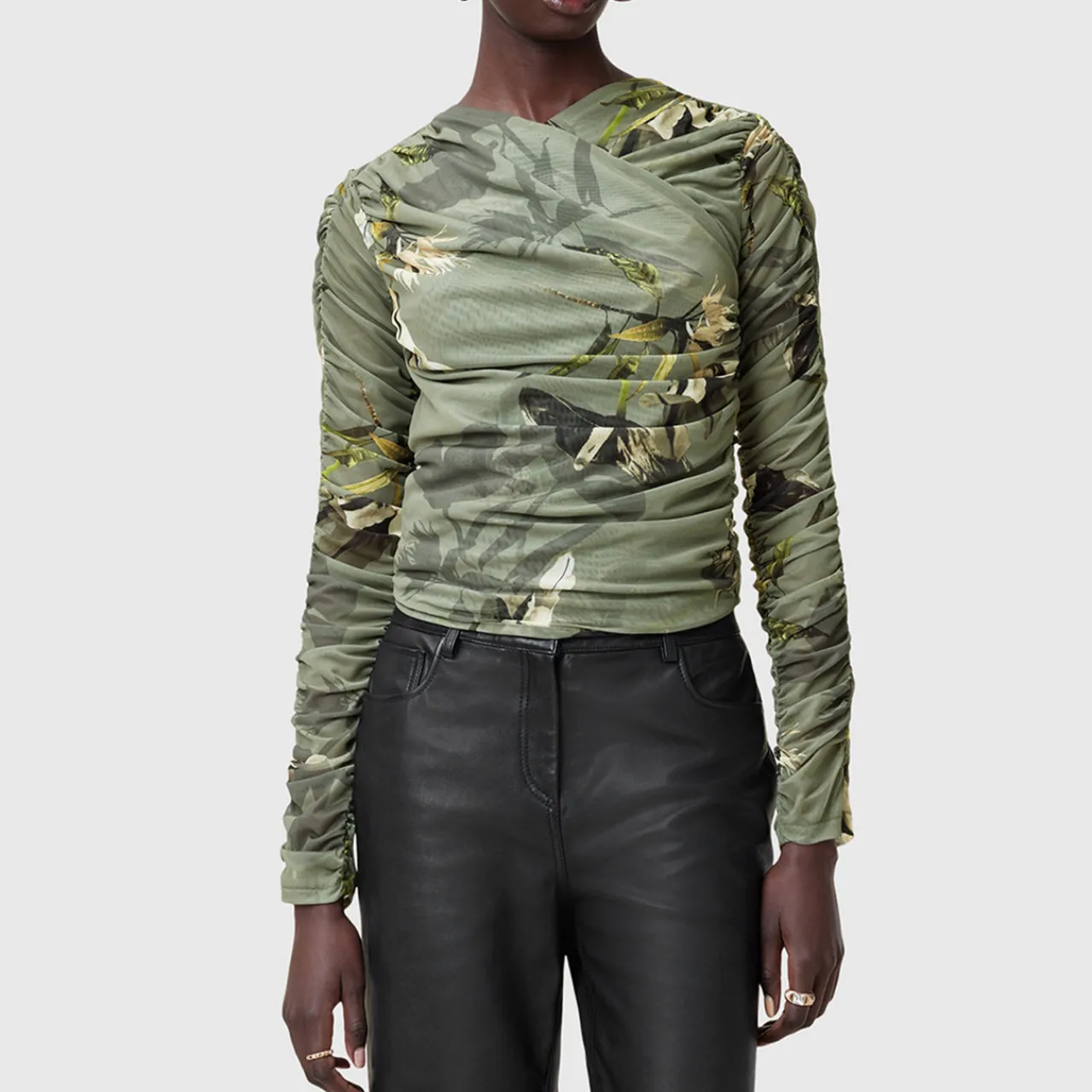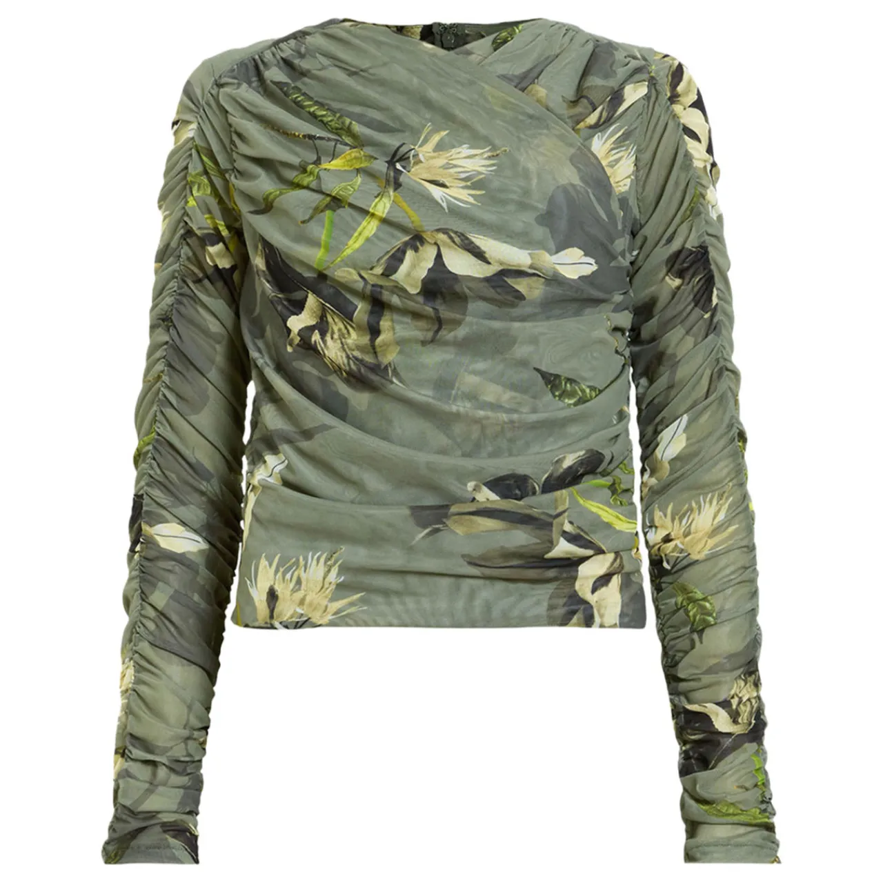 - Botannical print, long sleeves, ruched detail on sleeves, V-neckline, wrap-effect on neckline, curved hemline