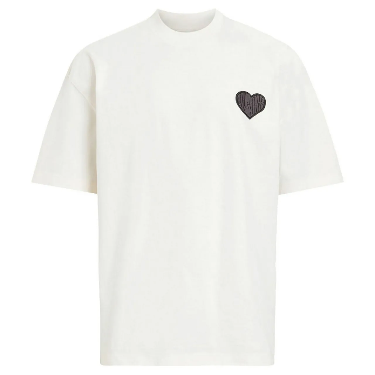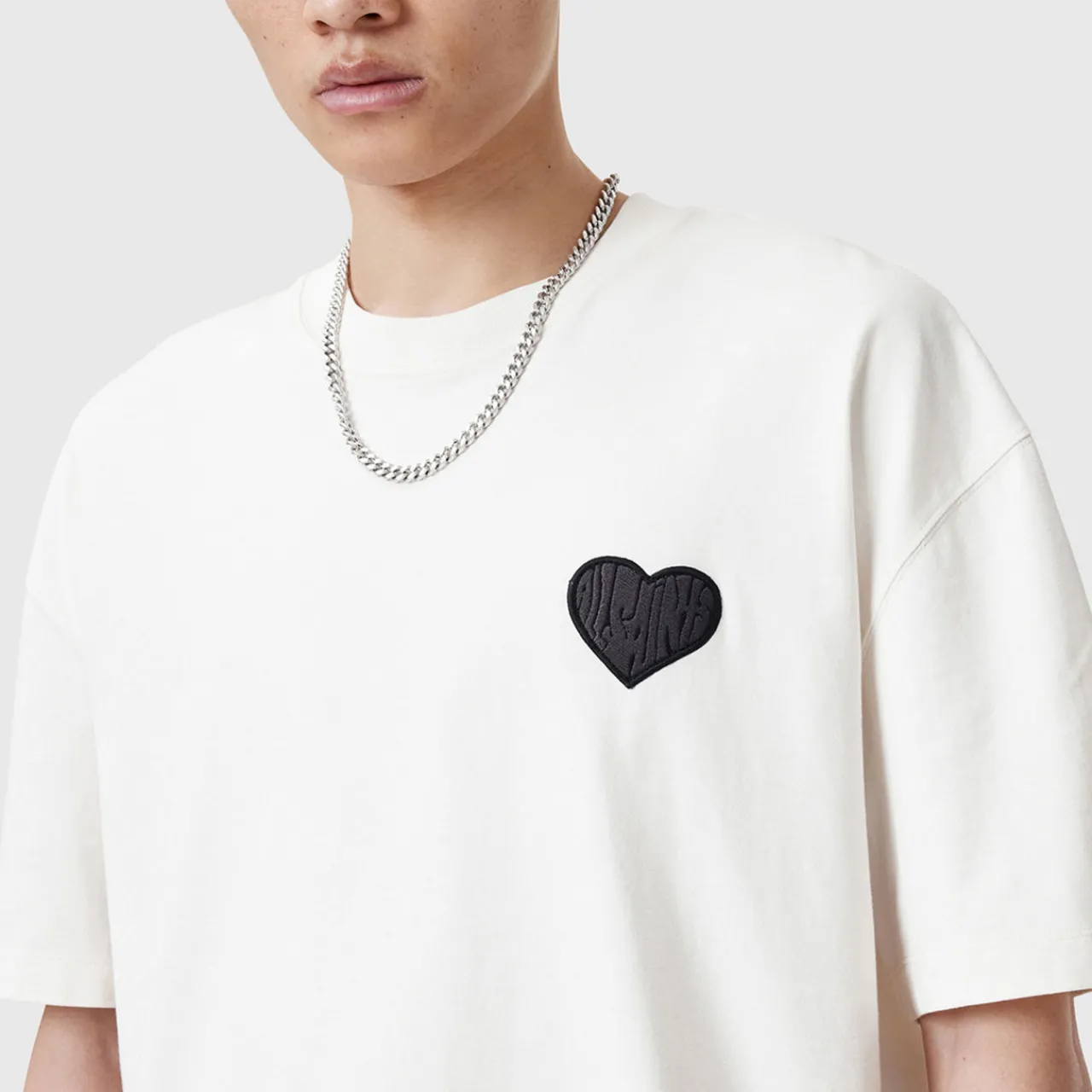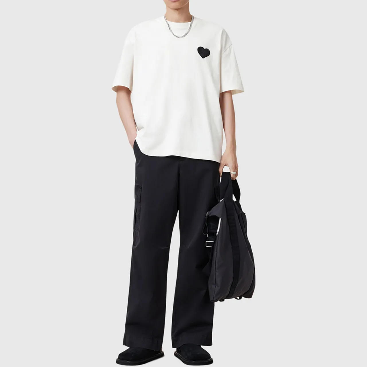 - Crew neckline, short sleeves, dropped shoulders, heart detail with logo branding, tonal stitching, pullover style, straight hemline, smooth fabric