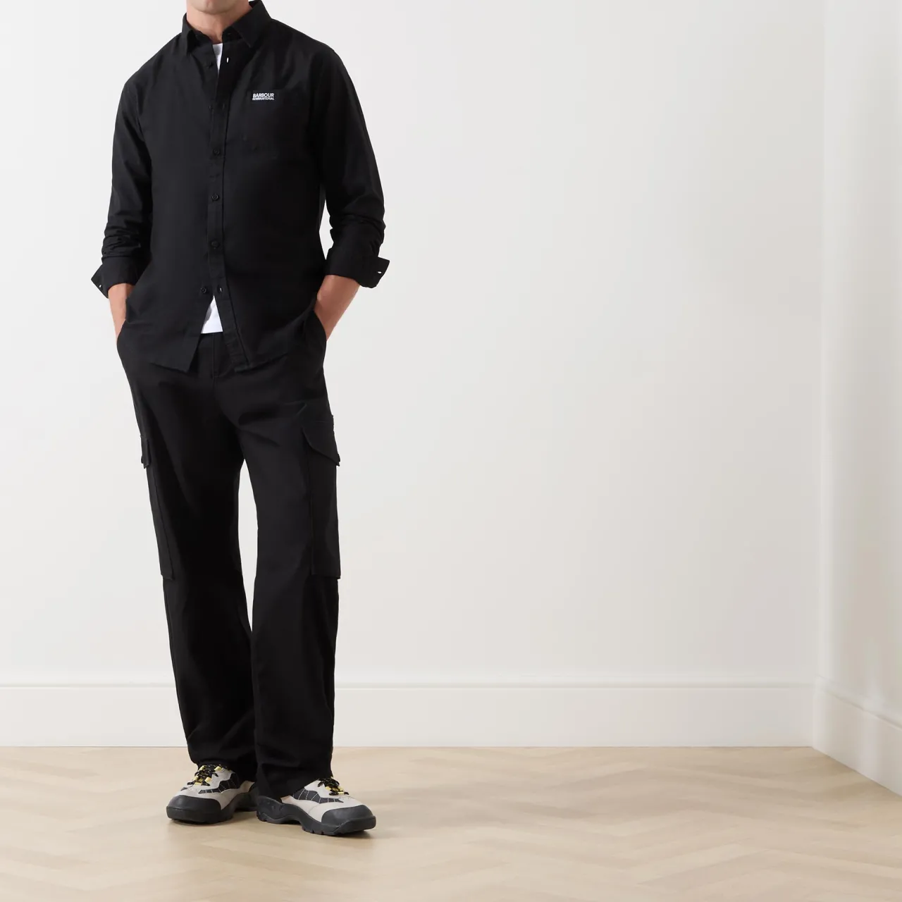 - Classic collar, button fastening, long sleeves, single cuff, curved hemline, chest patch pocket, logo details, box pleat at rear