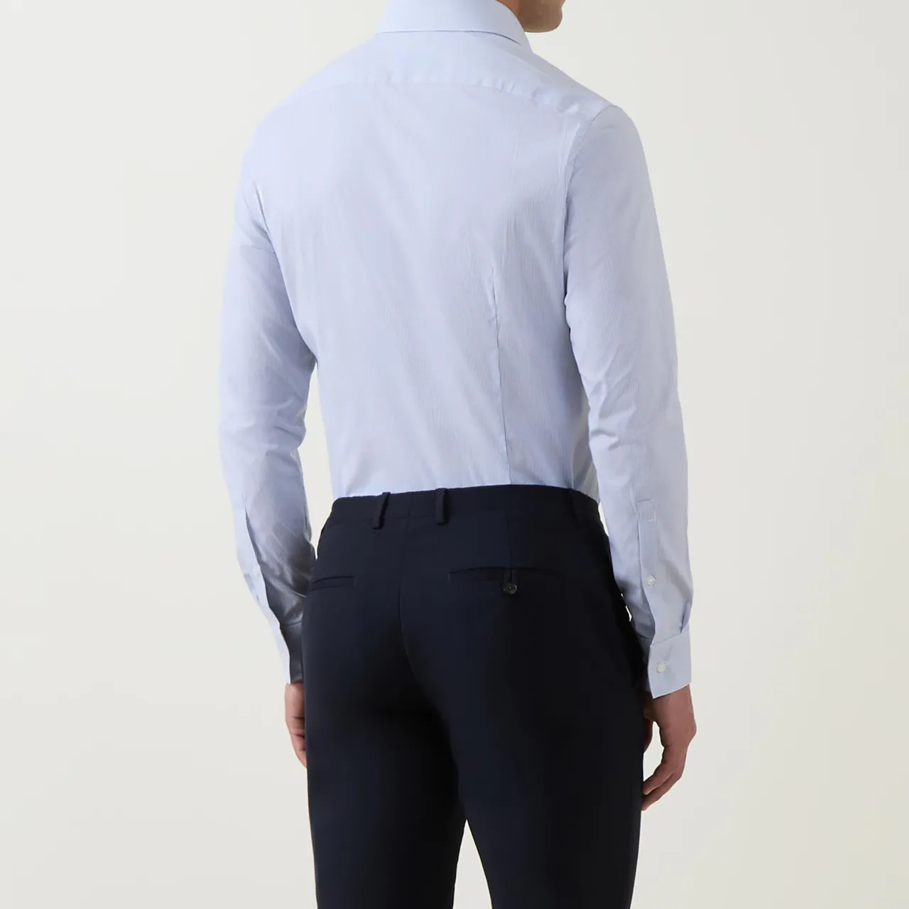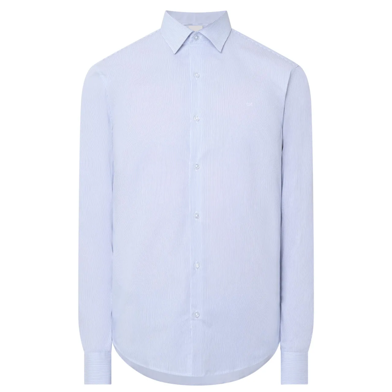 - Long sleeves, pointed collar, front button fastenings, CK logo embroidery, pinstripe pattern, darting to the back, single-button cuffs, curved hemline, smooth fabric