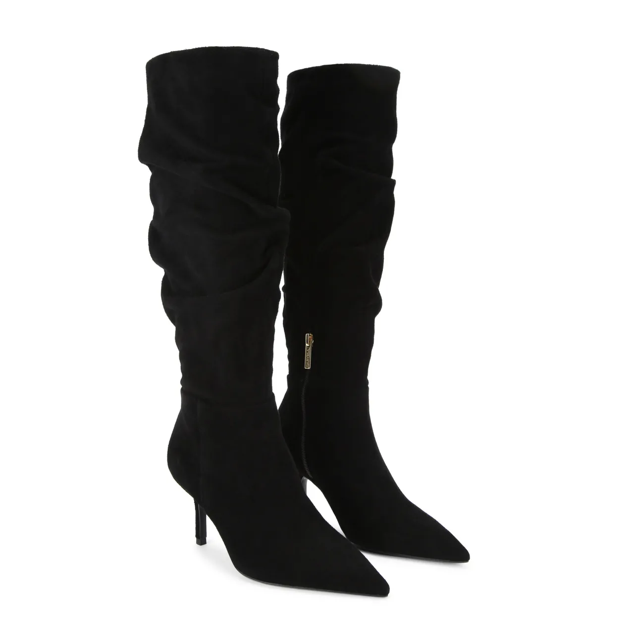 - Ruched design, reaches below the knee, pointed toe, stiletto heel, smooth suede finish