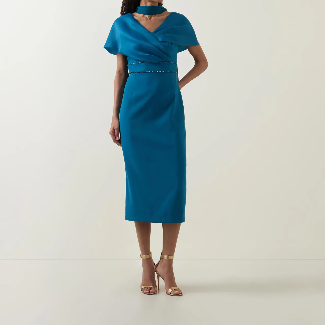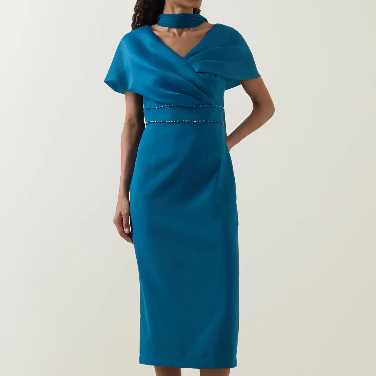 - V-neckline, short sleeves, neck tie, twisted design, gathered bust, embellished detailing around the waist, rear zip fastening, straight hem, midi length, smooth finish