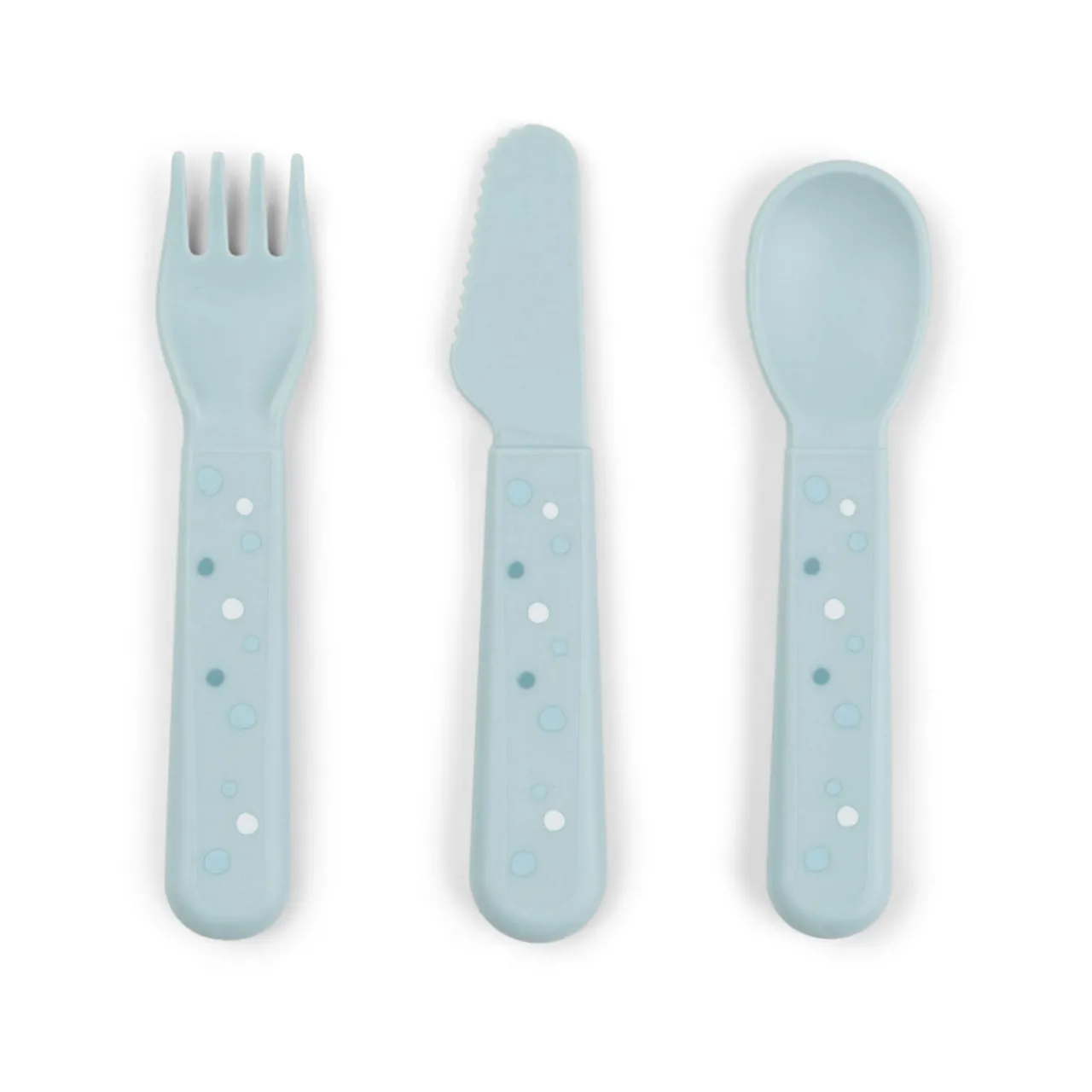 - Set of three, include one knife, fork and spoon, happy dots pattern, soft rounded edges, well-dimensioned for little hands