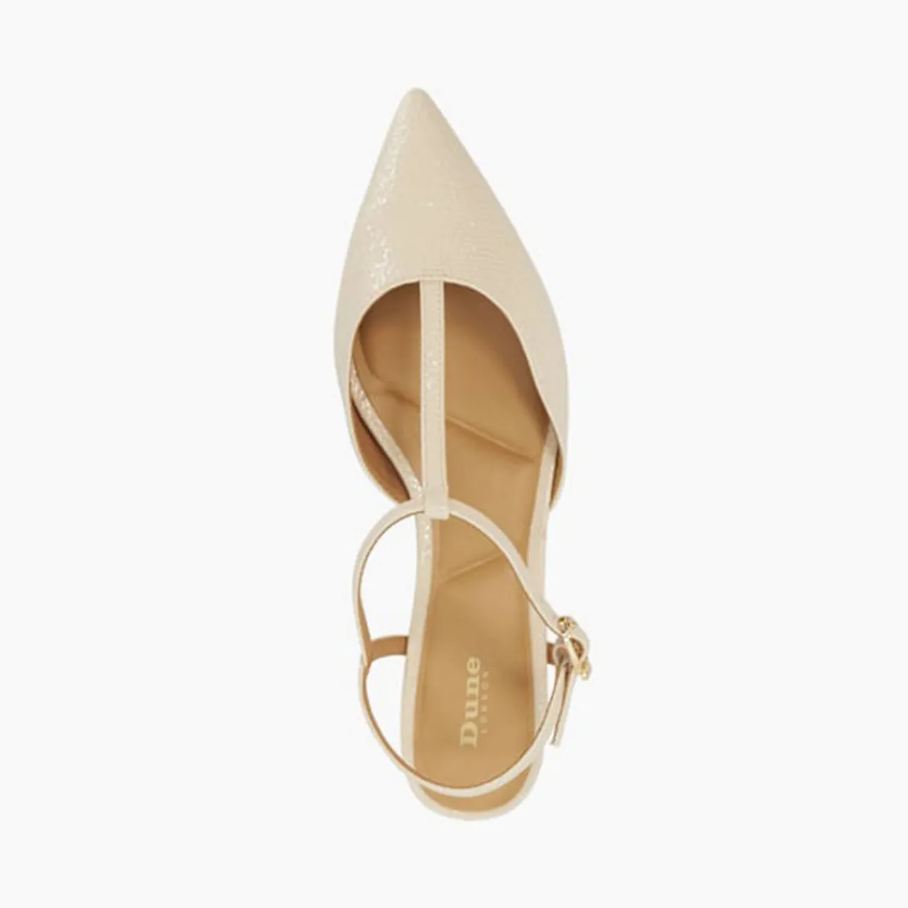 - T-bar strap, pointed toe, textured finish, adjustable ankle strap, gold-tone buckle fastening, low block heel