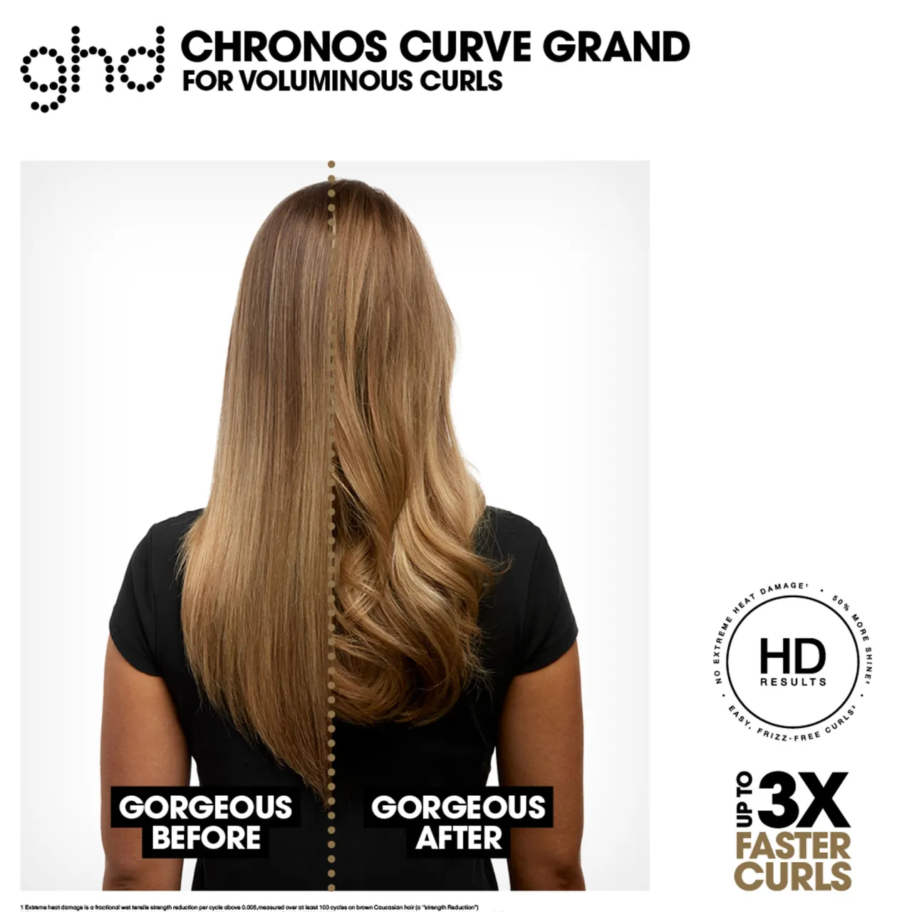 Description: The ghd grand tong is your go-to tool for voluminous curls, ideal for medium to long hair lengths. For 3x faster*, high-definition results for easy, frizz-free curls that last all day**