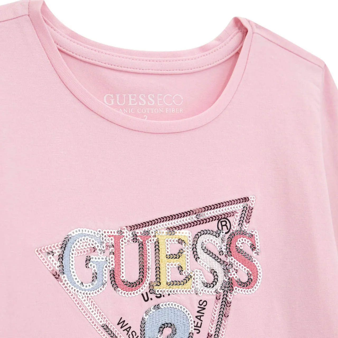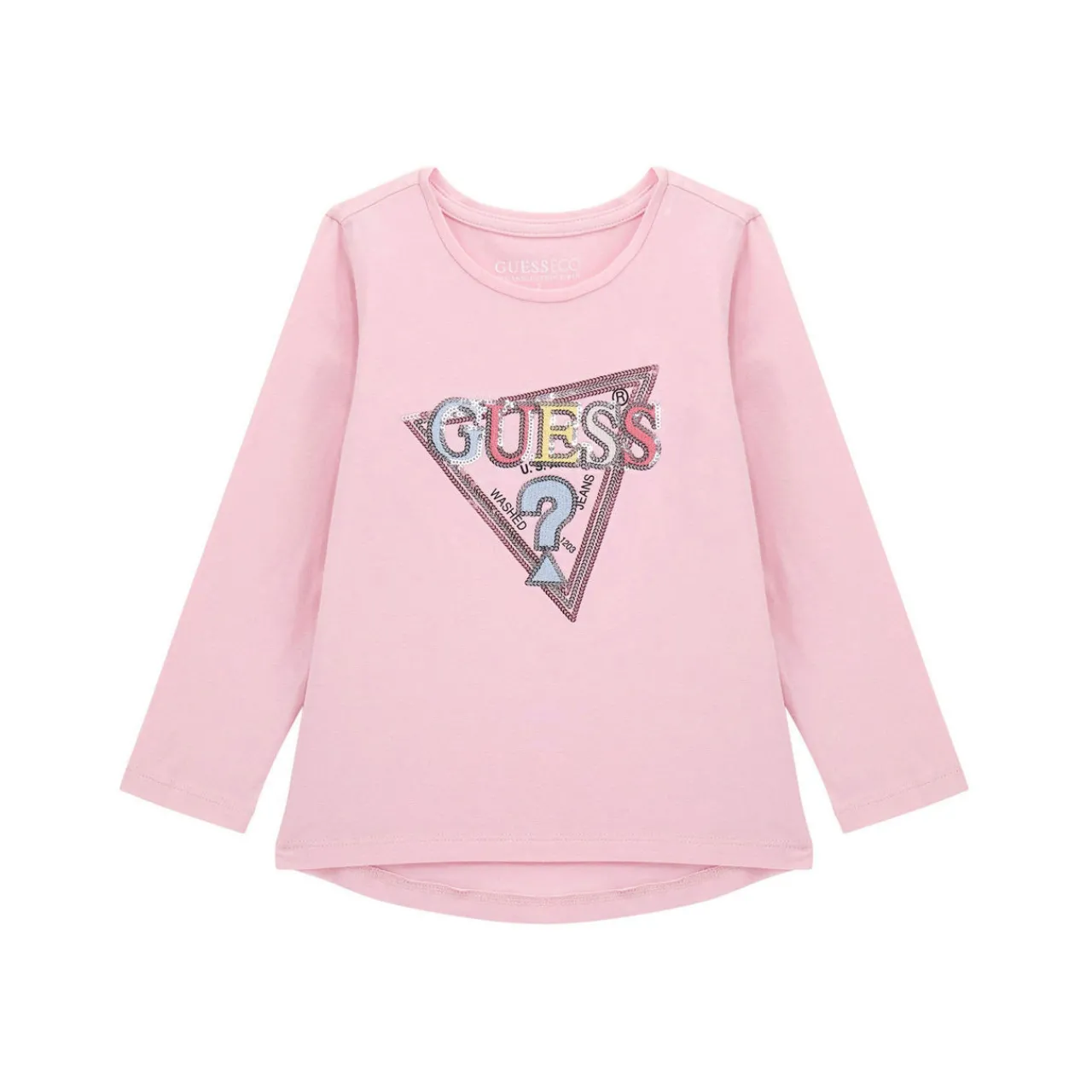 - High-low hem, long sleeves, round neckline, triangle logo, sequin embellishment