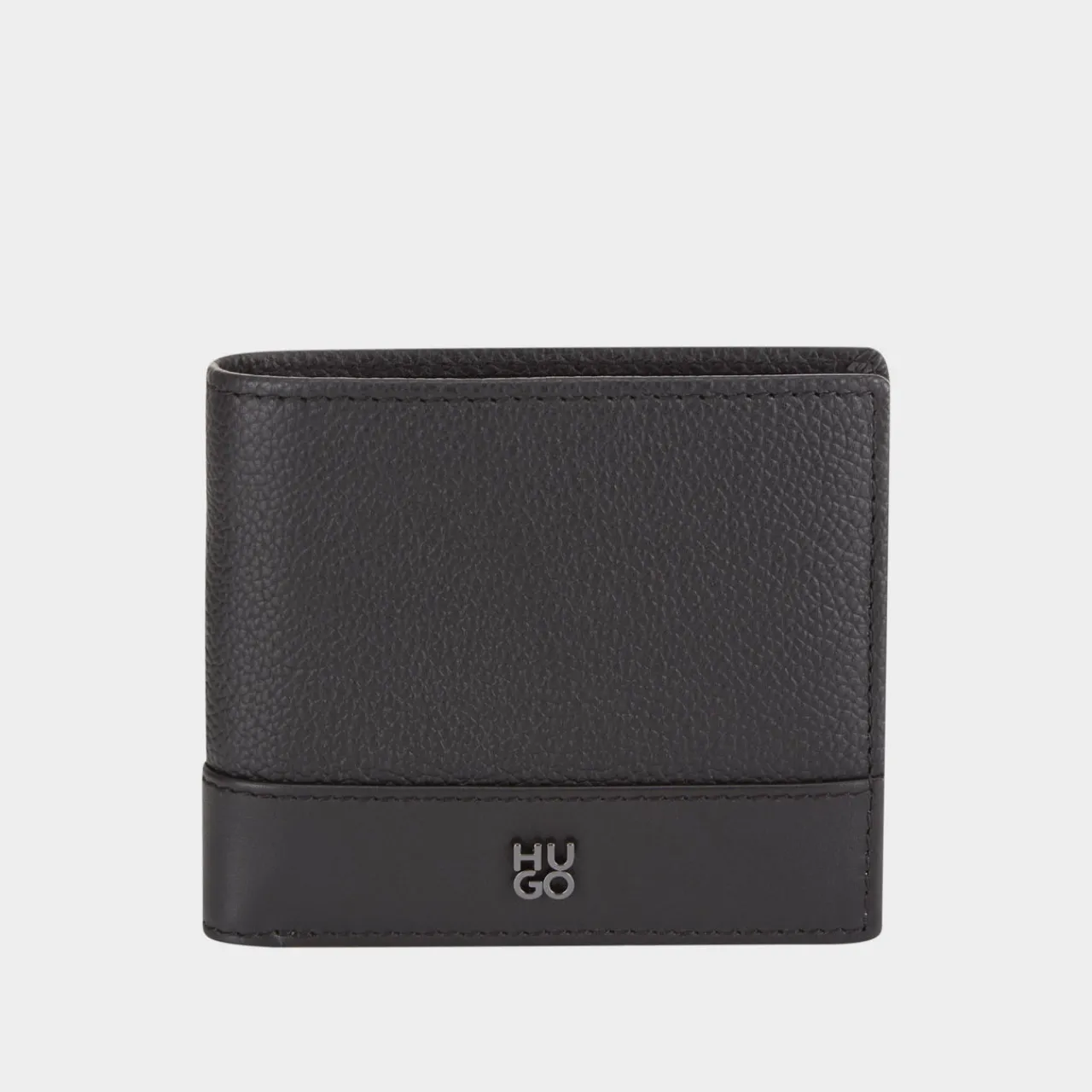- Stacked logo lettering, billfold style, tonal stitching, grained leather finish