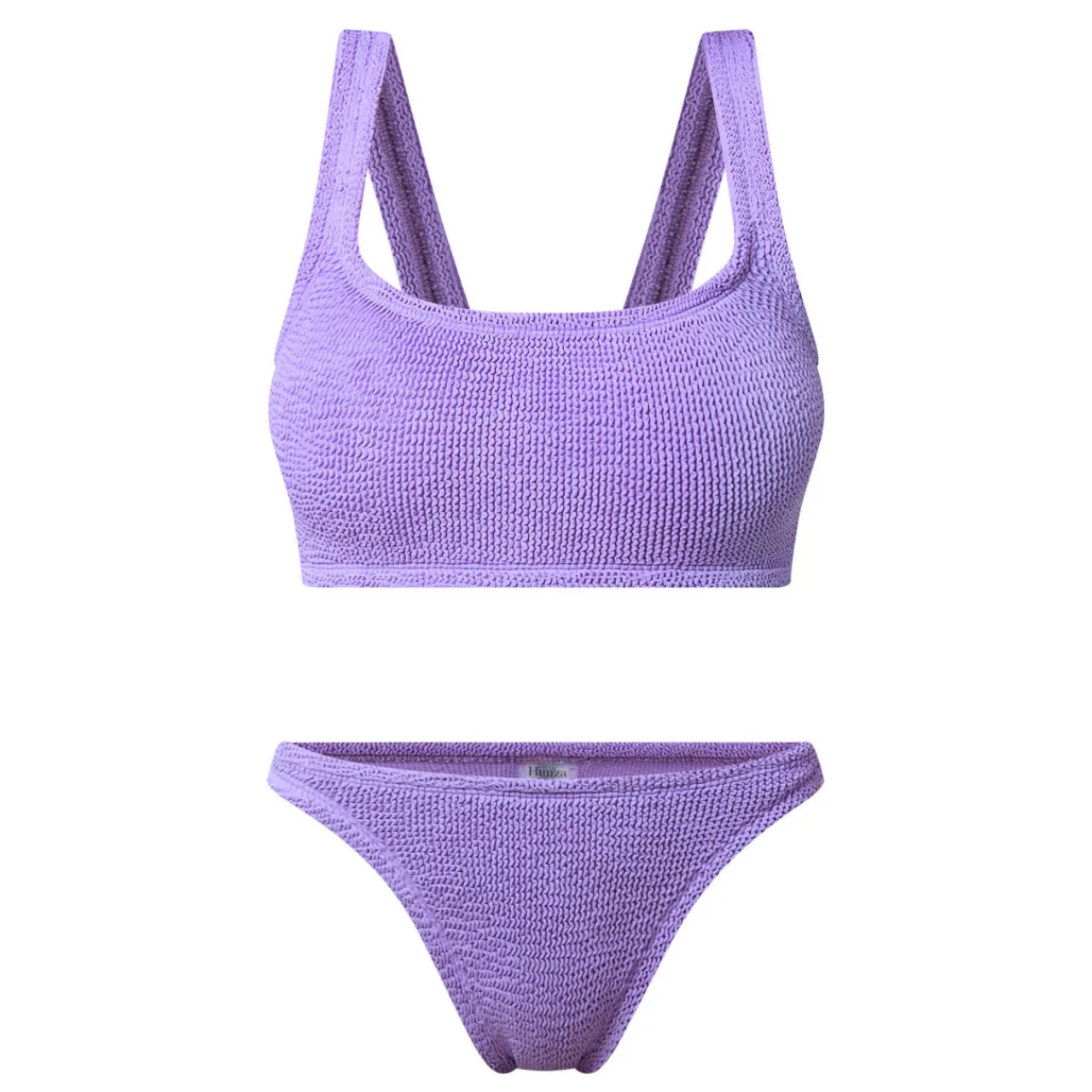 - Close fit, shoulder straps, high-rise bottoms, square neck, ribbed finish.