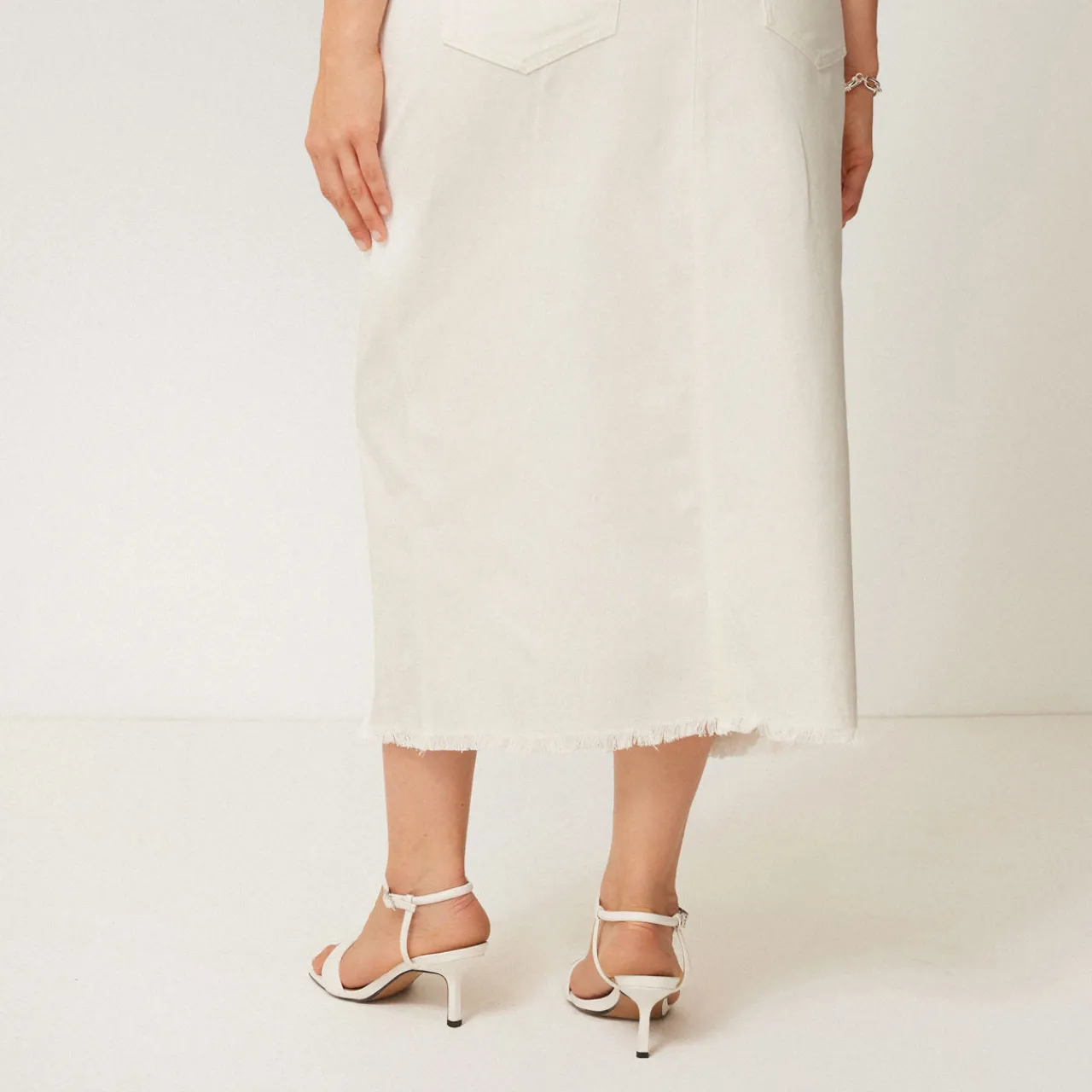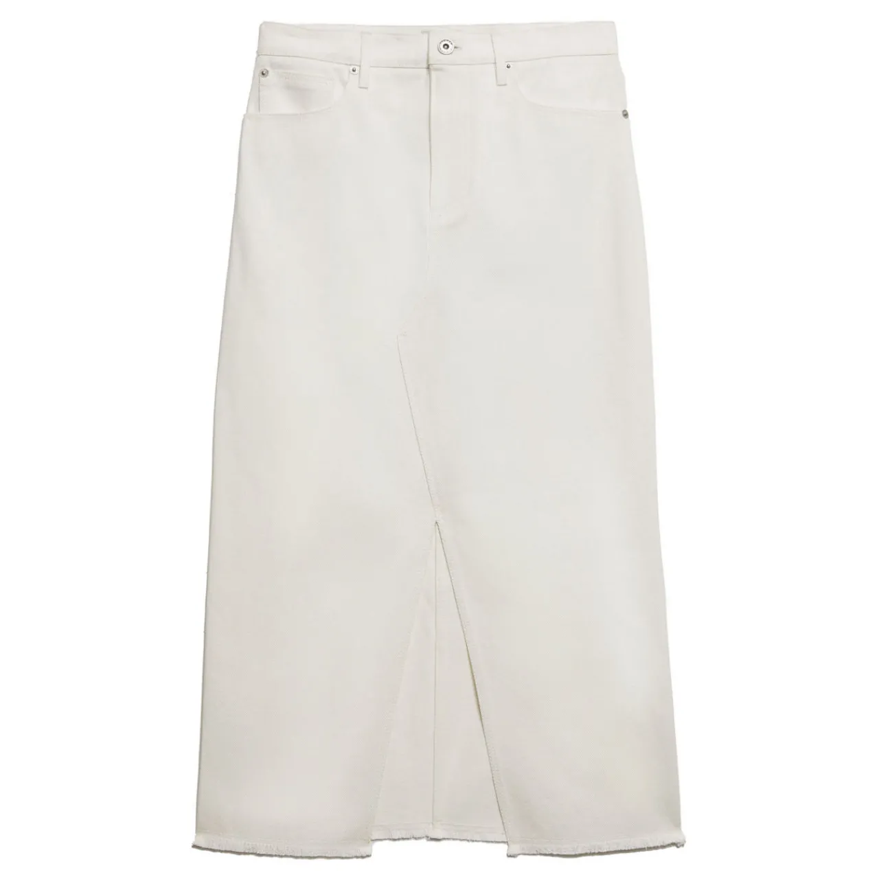 - Denim fabric, front split, frayed hem, five-pocket style, concealed fly, button fastening, belt loops