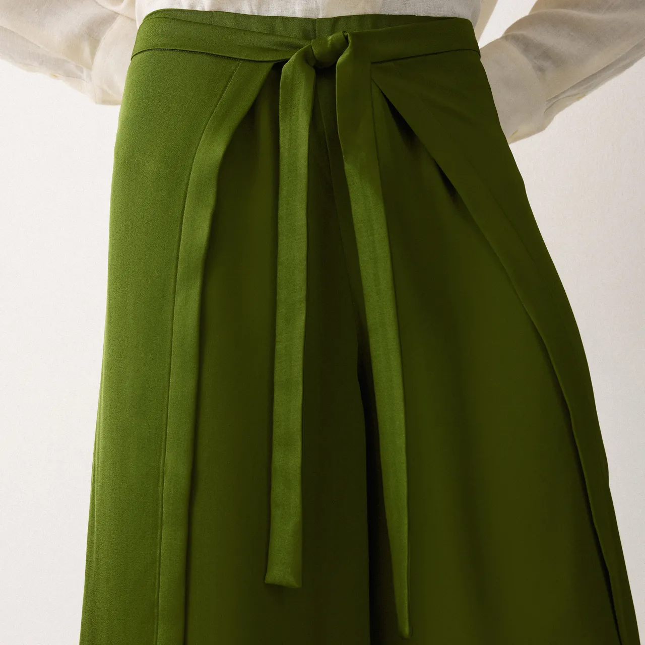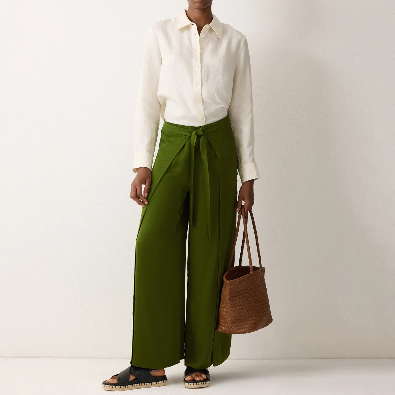 - Wrap design, self-tie front, fluid fabrication, wide-leg silhouette