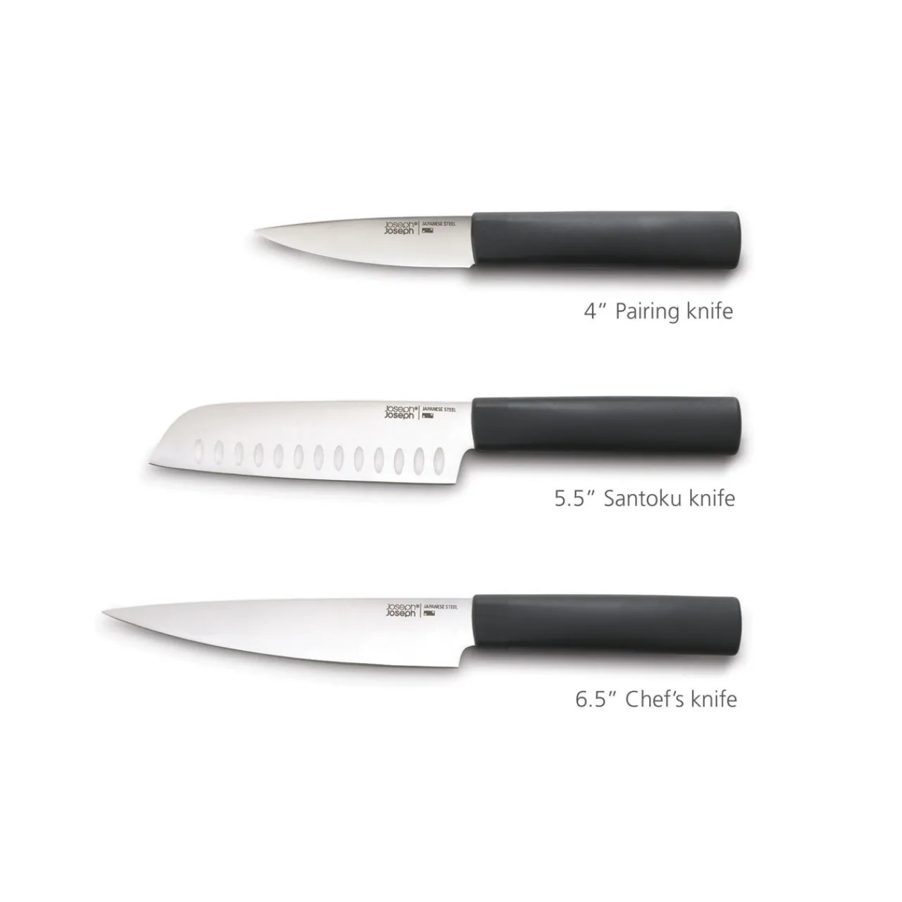 - Includes: 4in paring knife, 5.5in santoku knife, 6.5in chef’s knife, x3 chopping boards, storage stand