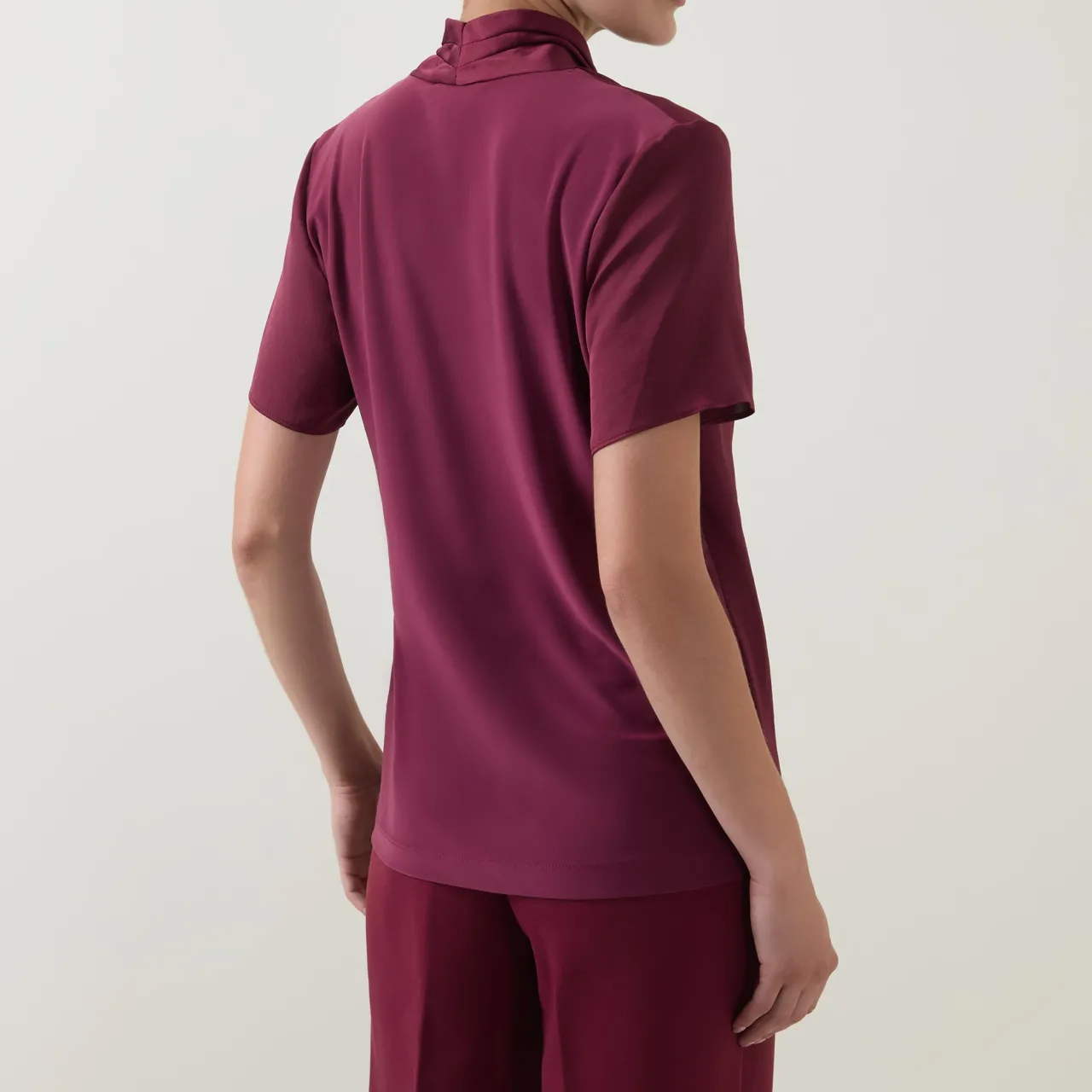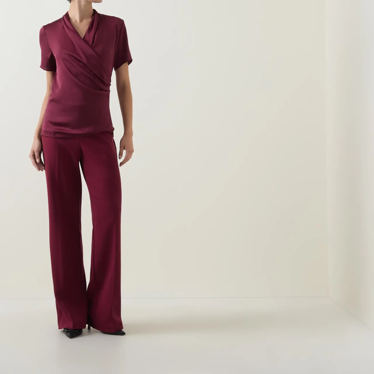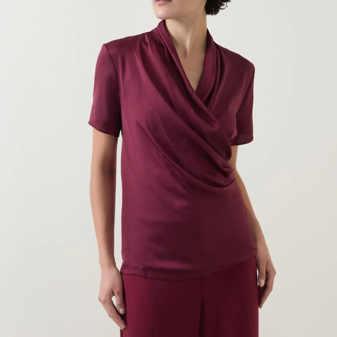 - Wrap-style front, short sleeves, gathered detailing, straight hem, lightweight, breathable, silky-knit fabric