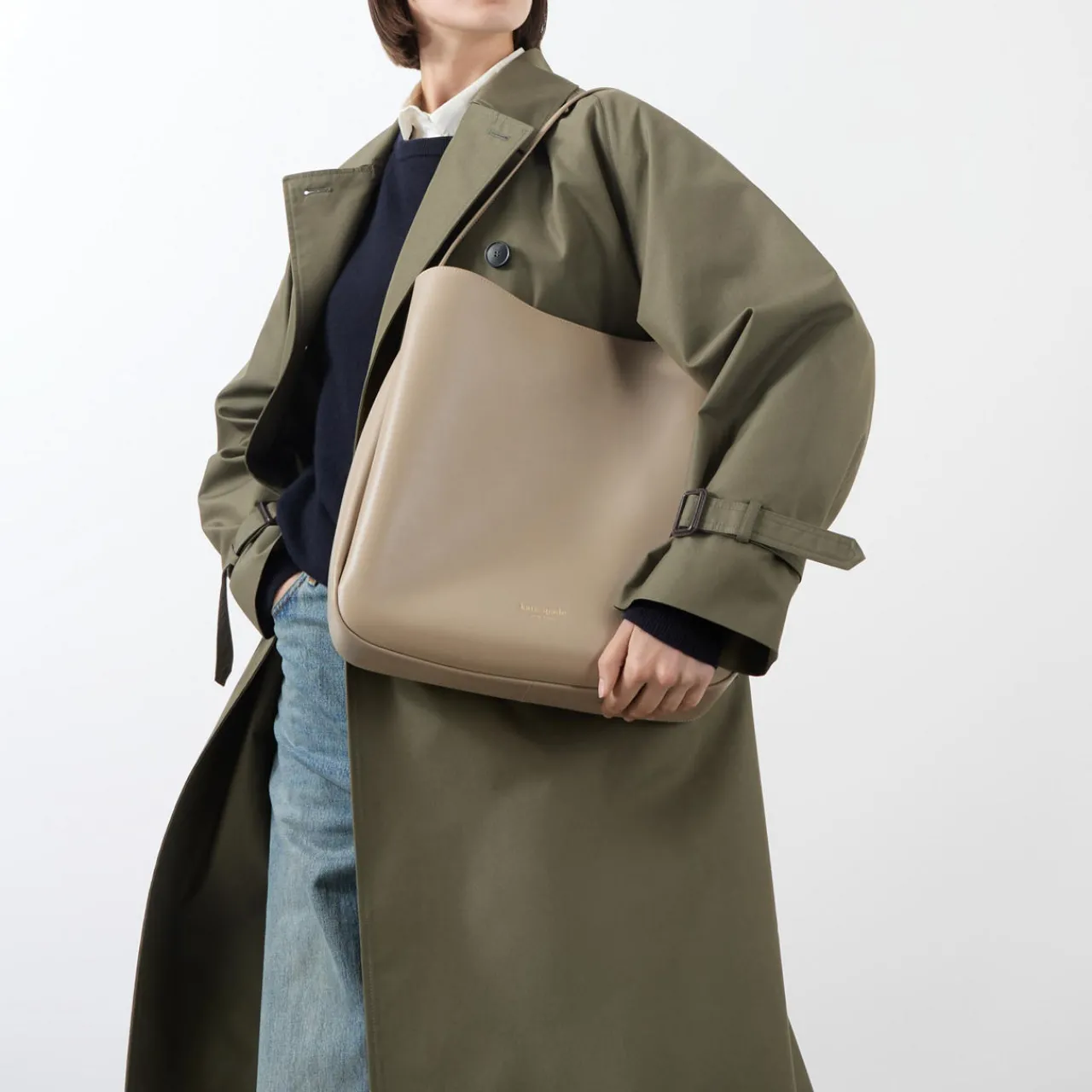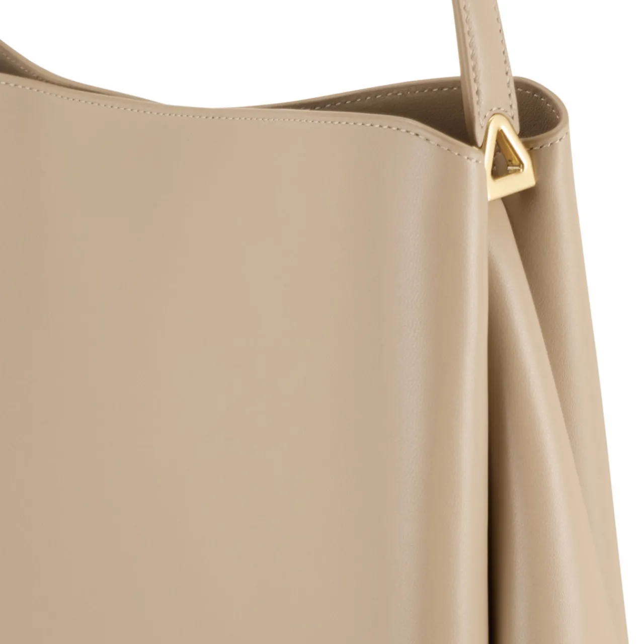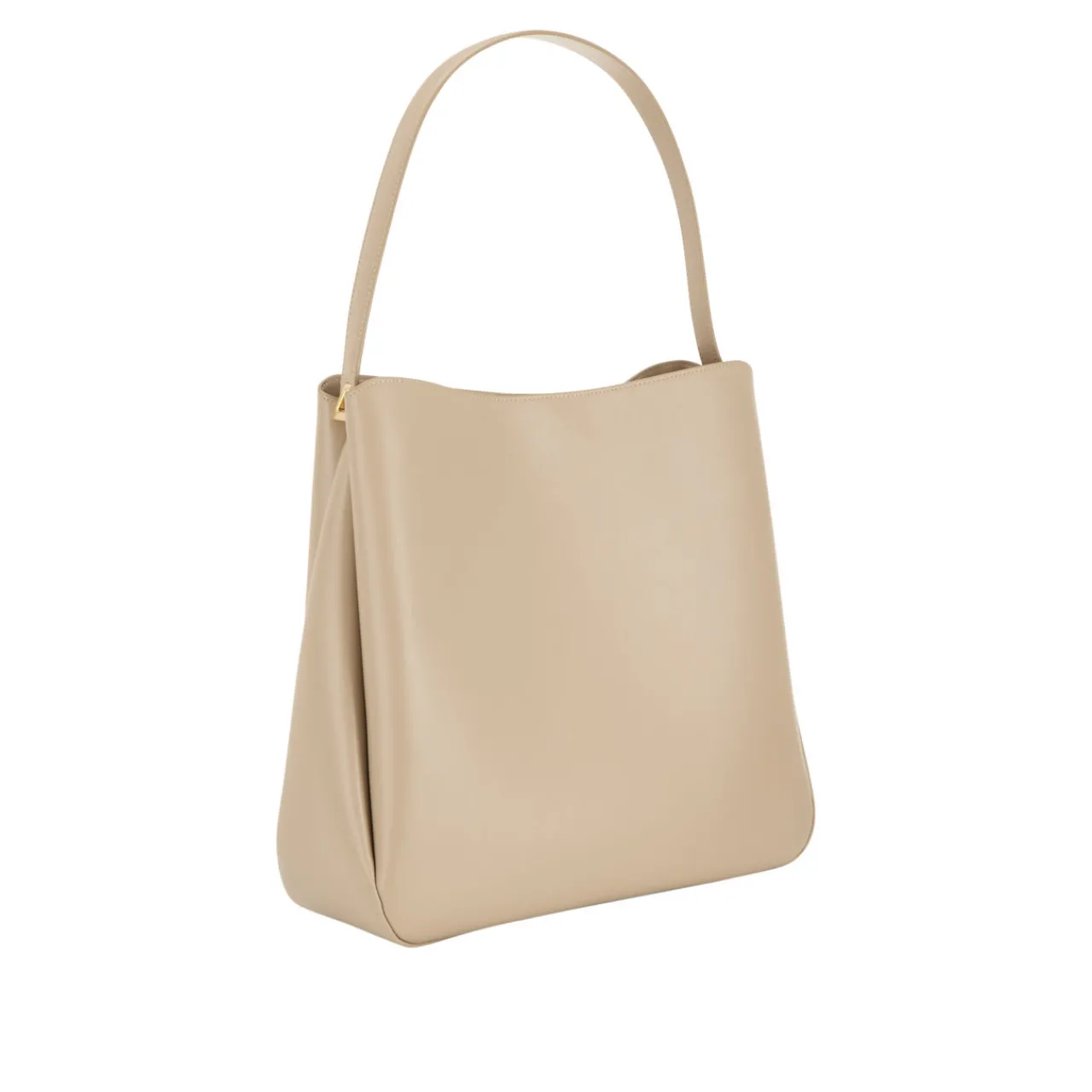 - Fixed shoulder strap, secure magnetic fastening, bucket shape, tonal stitching, logo branding, smooth leather finish, gold-tone hardware