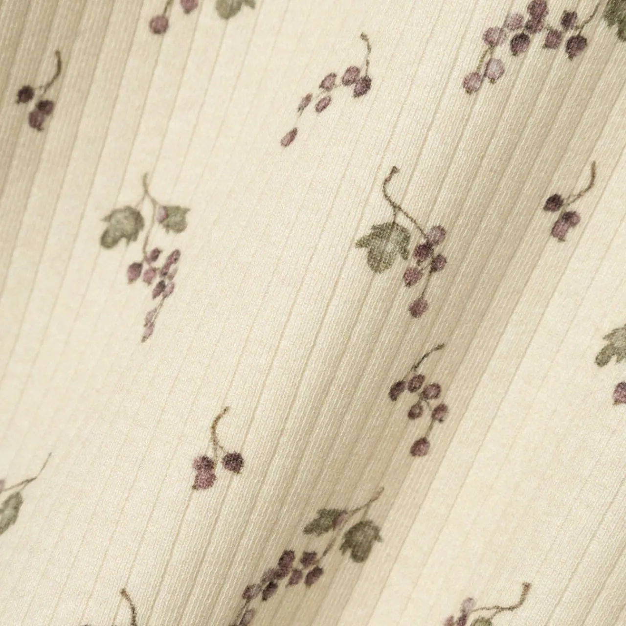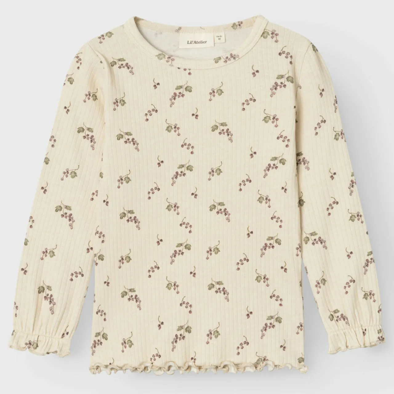 - Long sleeves, round neckline, berry print, ruffle cuffs and hemline, ribbed fabric