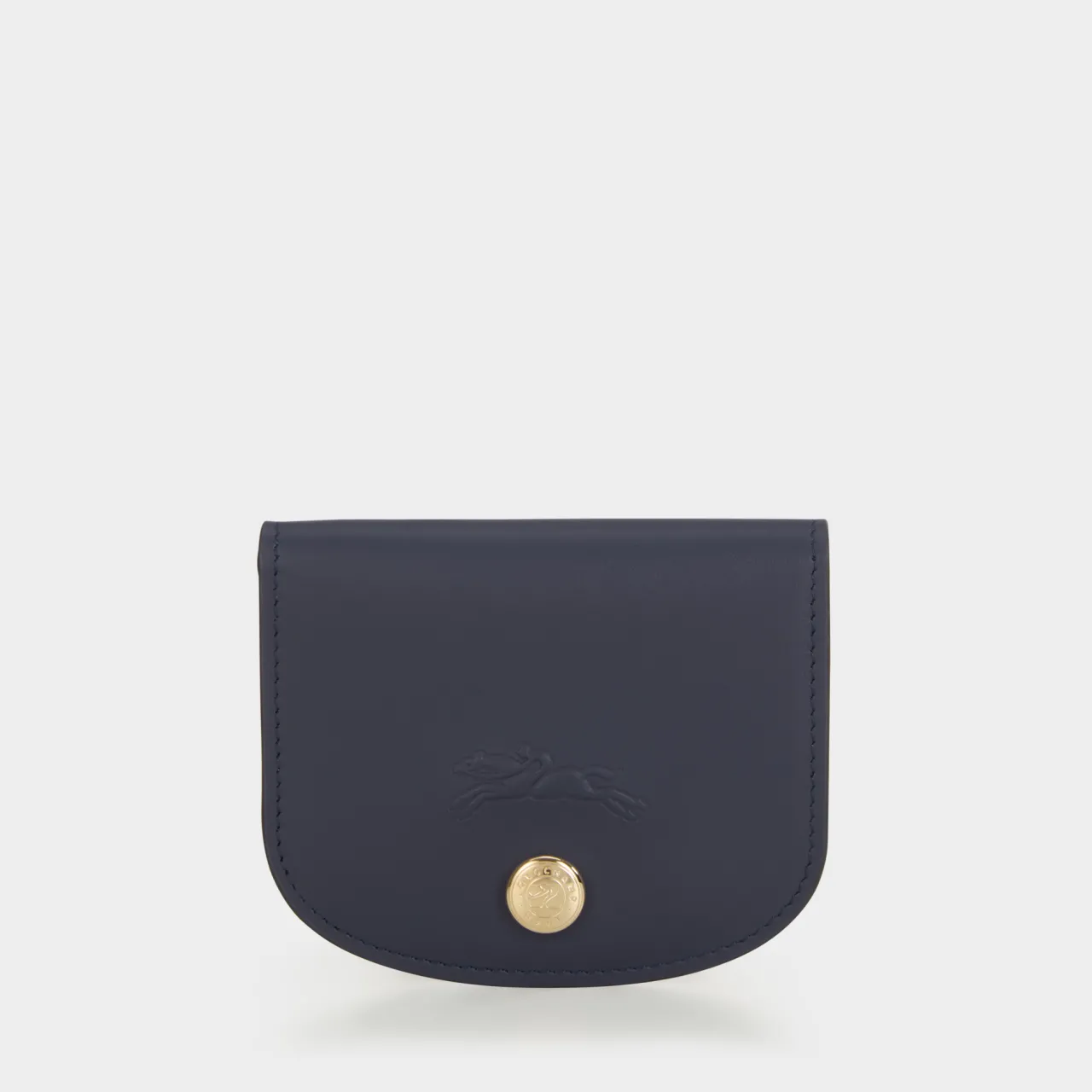 - Curved shape, gold-tone hardware, smooth finish, snap button fastening, billfold style, two exterior card slots, four interior card slots, logo details