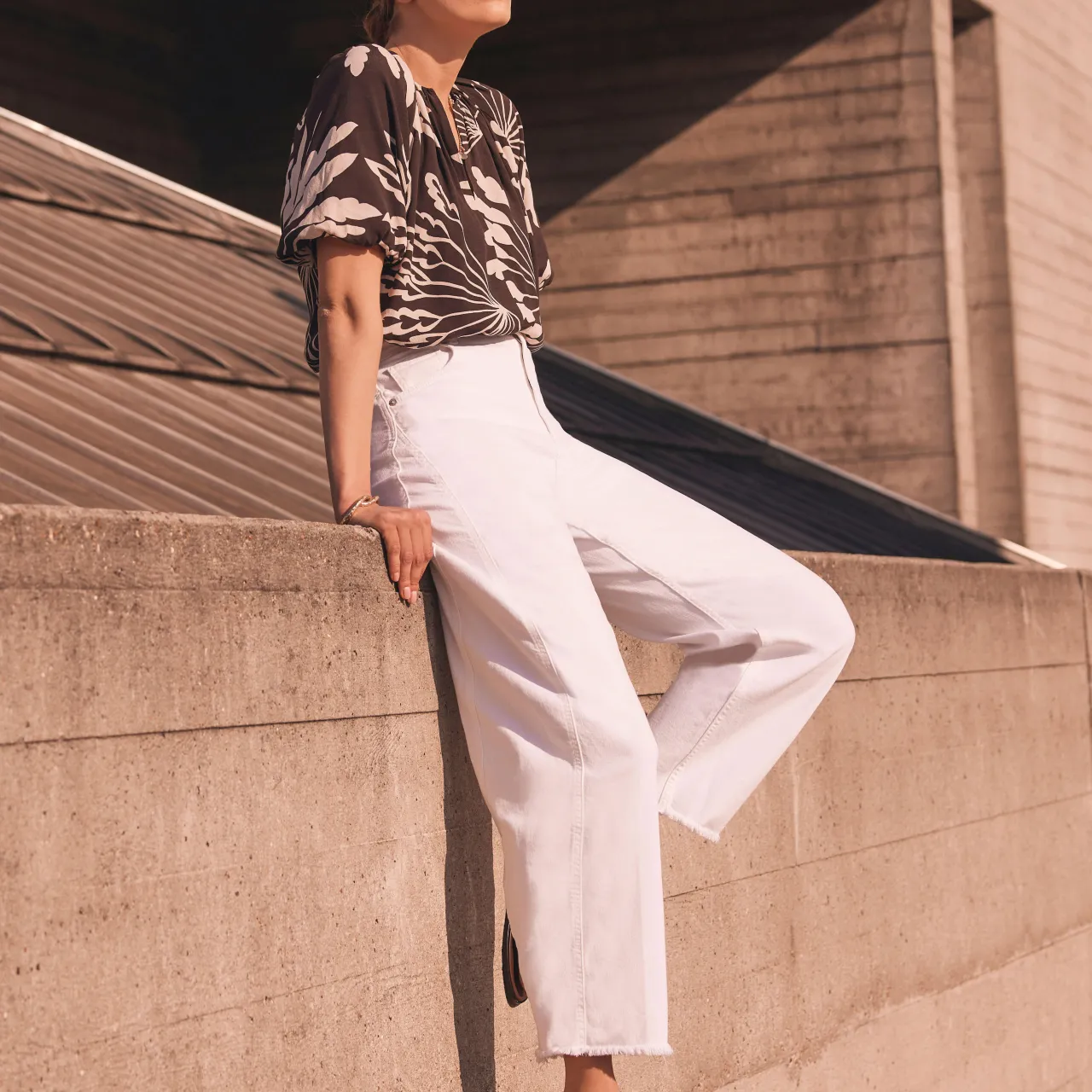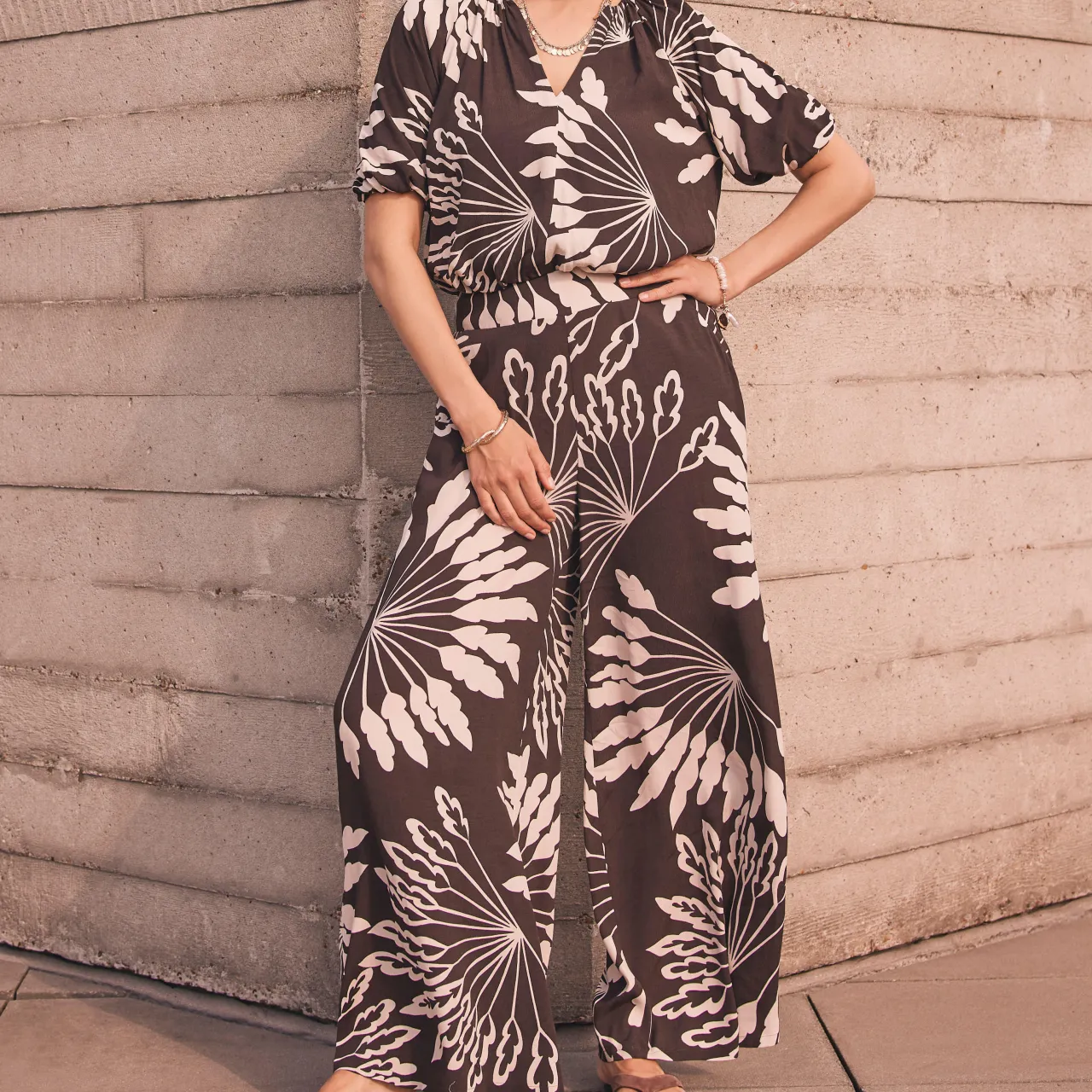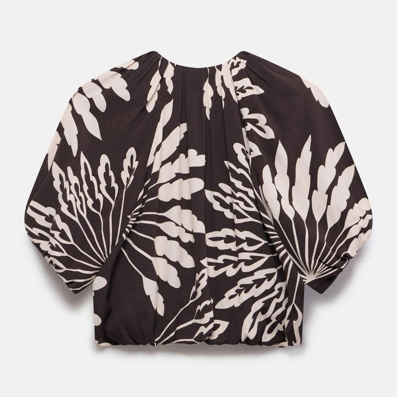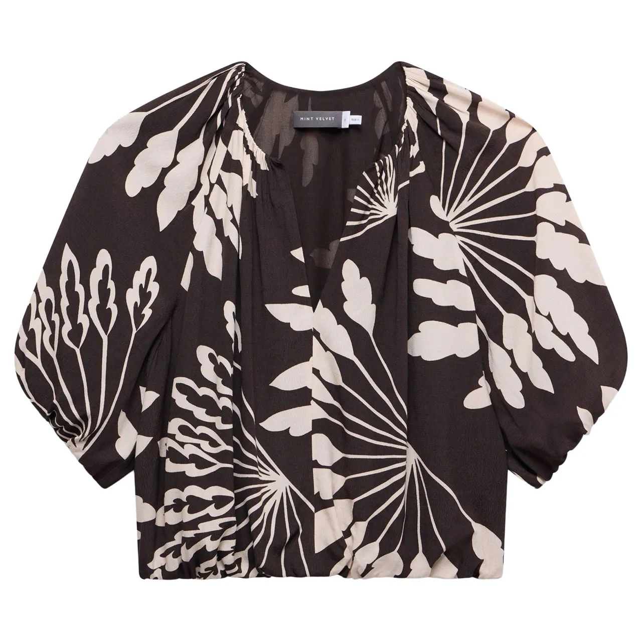- Palm print, V-neckline, short puff sleeves, elasticated waistband
