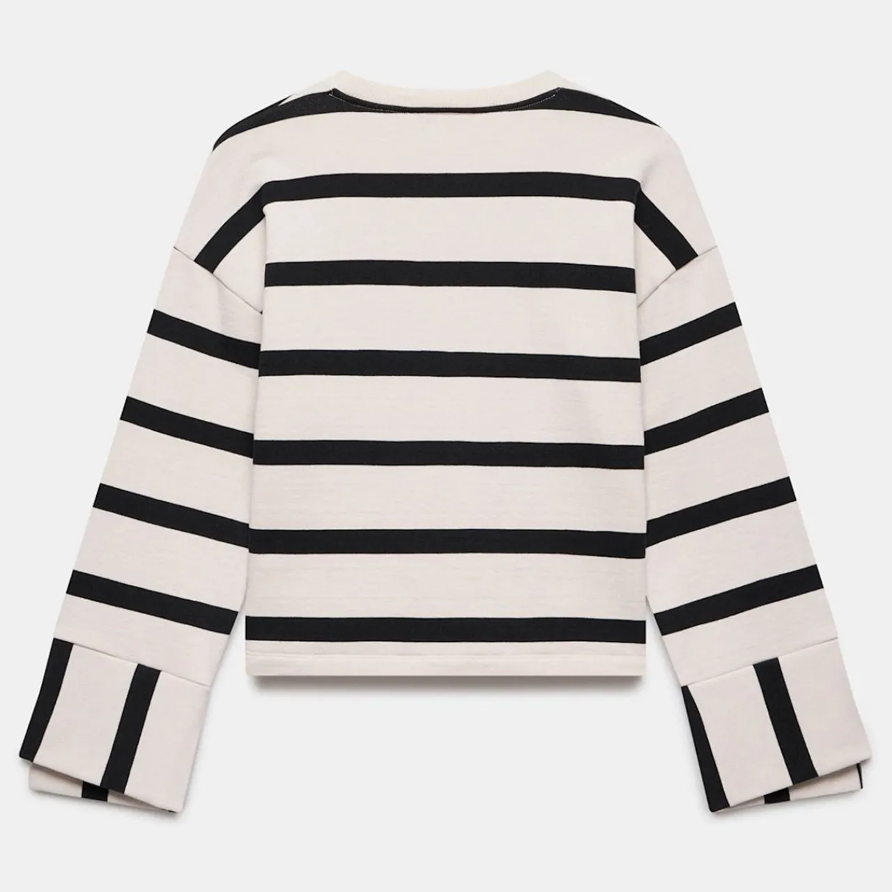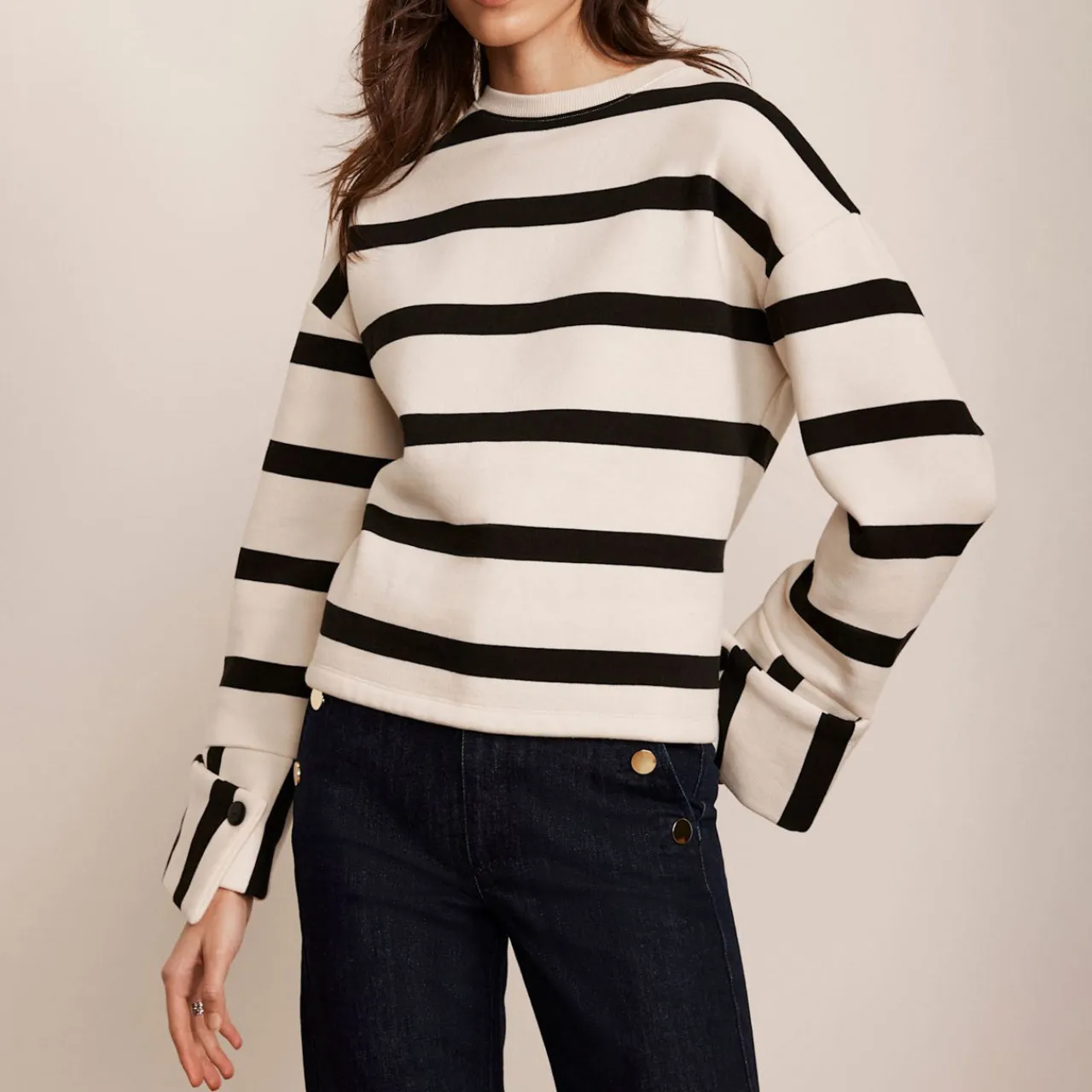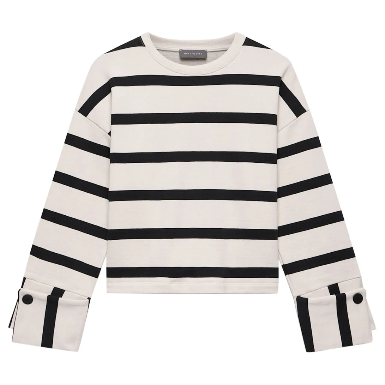 - Striped, crew neckline, long sleeves, button-back cuffs