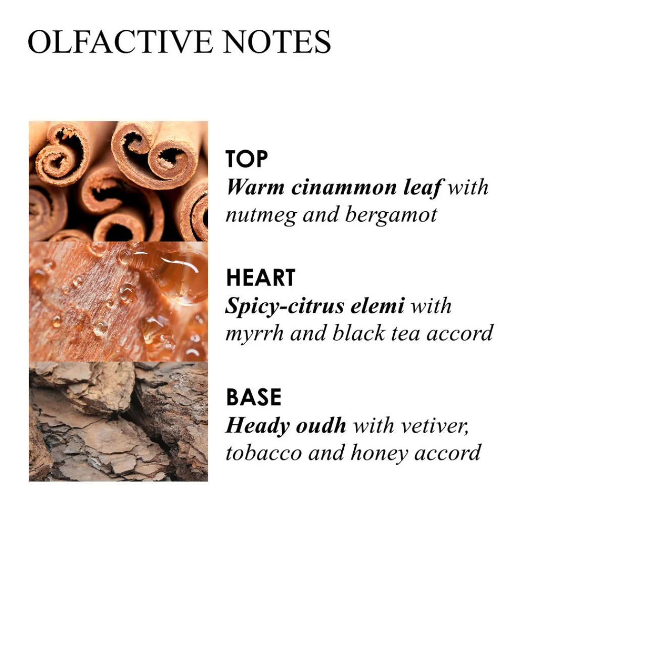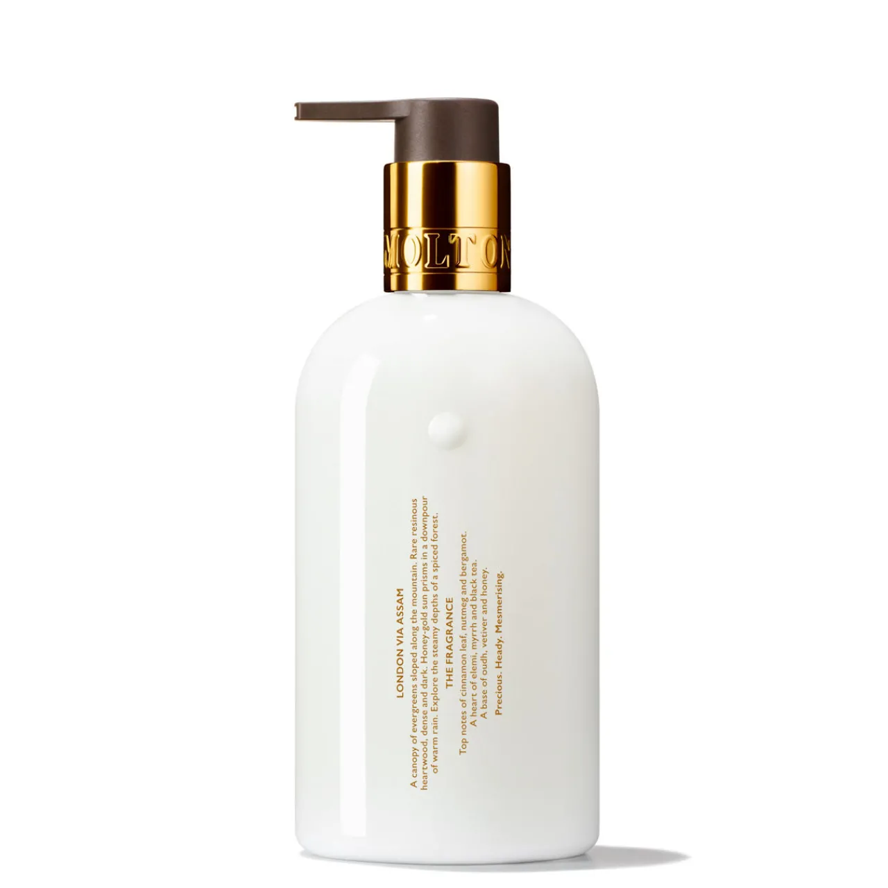 Leave hands comfortably hydrated and scented with this nourishing Hand Lotion, infused with precious notes of opulent oudh, elemi, myrrh and vegan honey. SUGGESTED USE Massage into hands after cleansing with the matching Fine Liquid Hand Wash to hydrate, protect and fragrance skin. THE FRAGRANCE Top notes of cinnamon leaf, nutmeg and bergamot. A heart of elemi, myrrh and black tea. A base of oudh, vetiver and honey. Fragrance family: WOODY EXPLORE London via Assam A canopy of evergreens sloped along the mountain. Rare resinous heartwood, dense and dark. Honey-gold sun prisms in a downpour of warm rain. Explore the steamy depths of a spiced forest. Precious. Heady. Mesmerising.