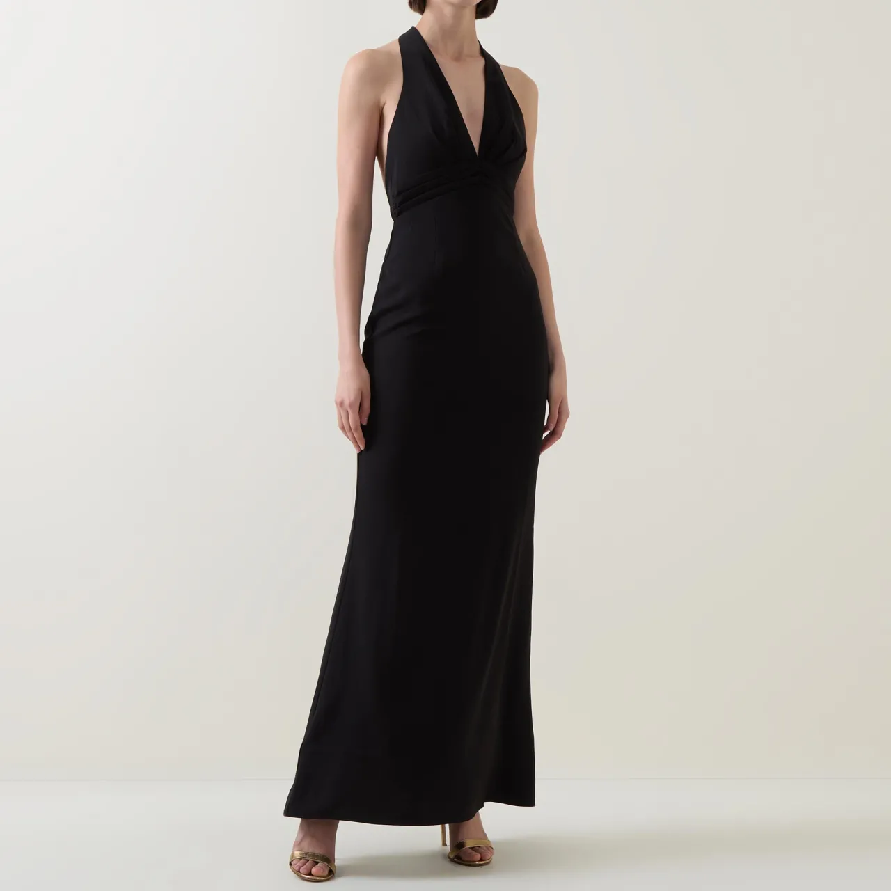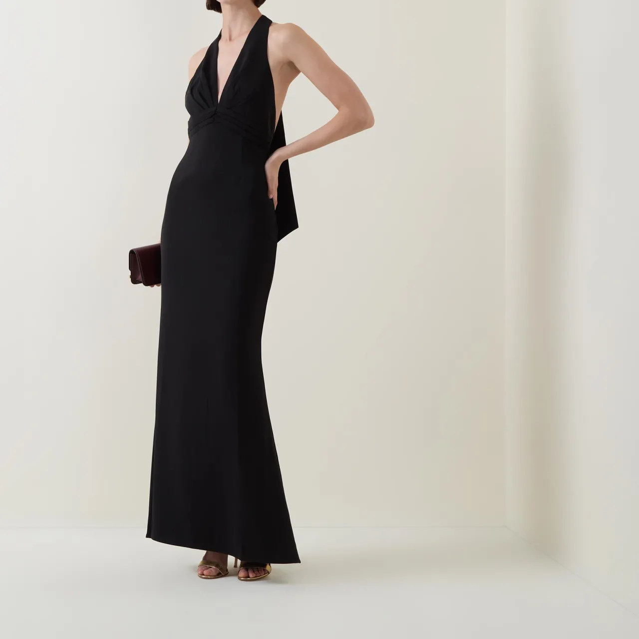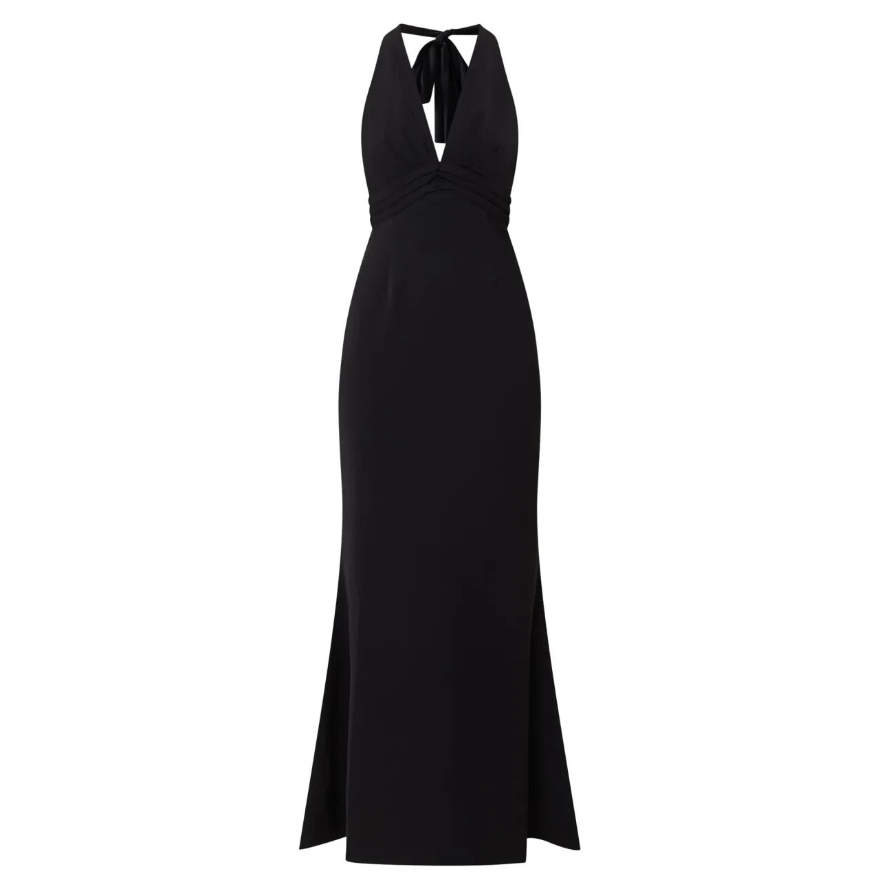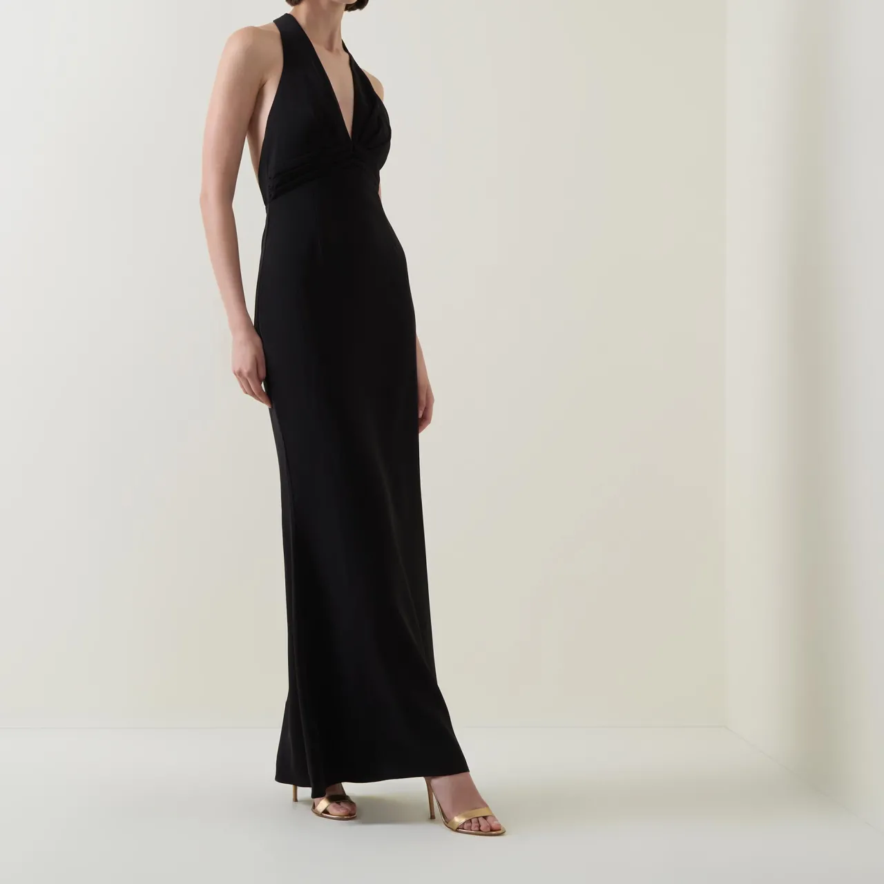 - V-neckline with draped tie details, open low back, discreet zip closure to back