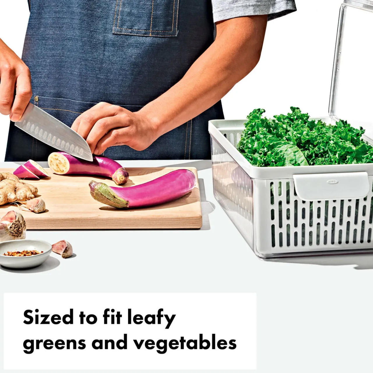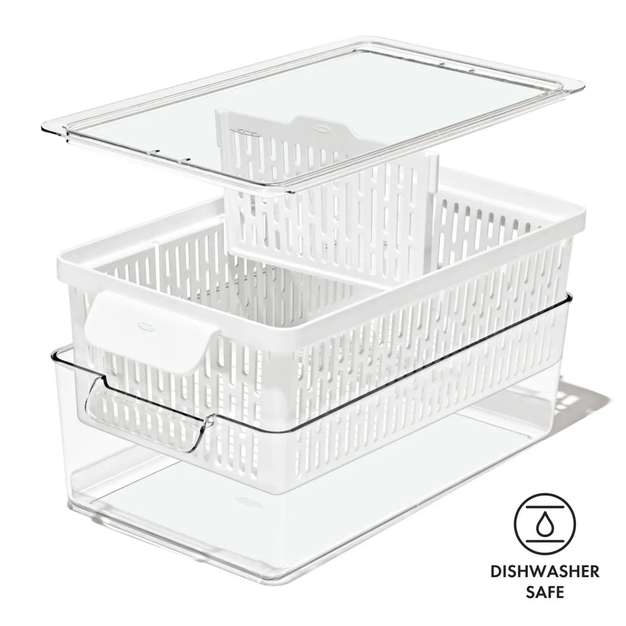 - Fridge-friendly fruit and vegetable storage, adjustable divider for organization, removable inner basket for rinsing produce and for air circulation, comfortable handle, pivoting lid, BPA-free