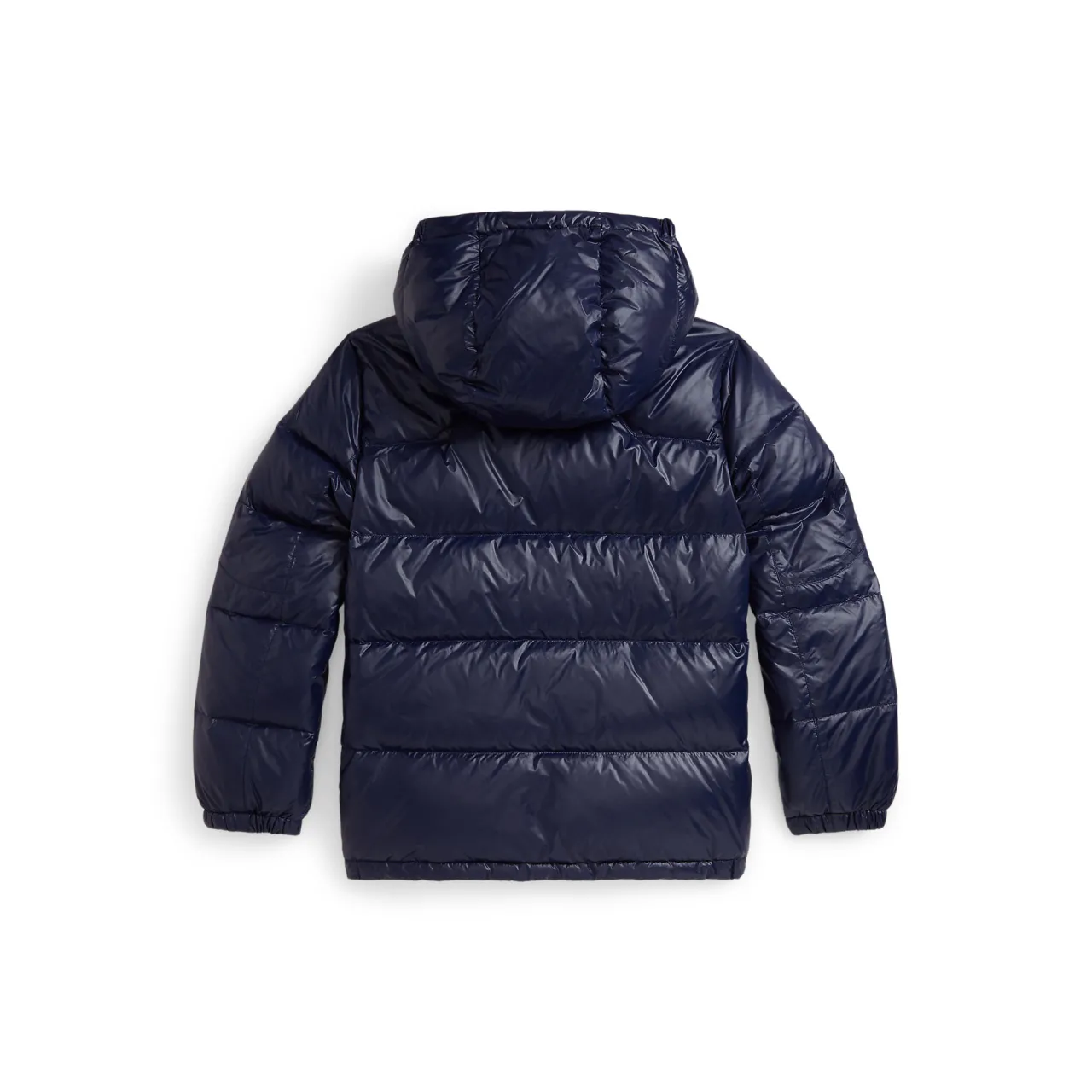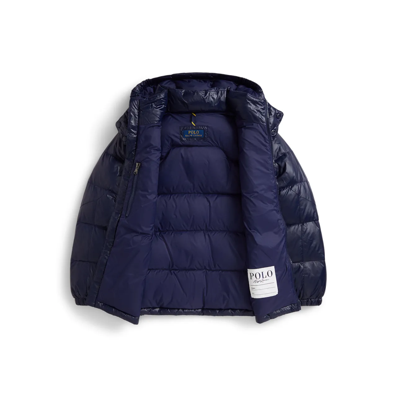 - Water-repellent shell, 650-fill-power down, snap-off hood for extra protection, signature embroidered Polo logo, mock neck, full-zip front fastening with a flap at the top that prevents chafing, Polo logo zipper pull tabs, long sleeves, elasticated cuffs, left chest zip pocket, two front waist zip pockets, internal right chest pocket, elasticated sides at the hem, signature name tag label inside, fully lined and filled
