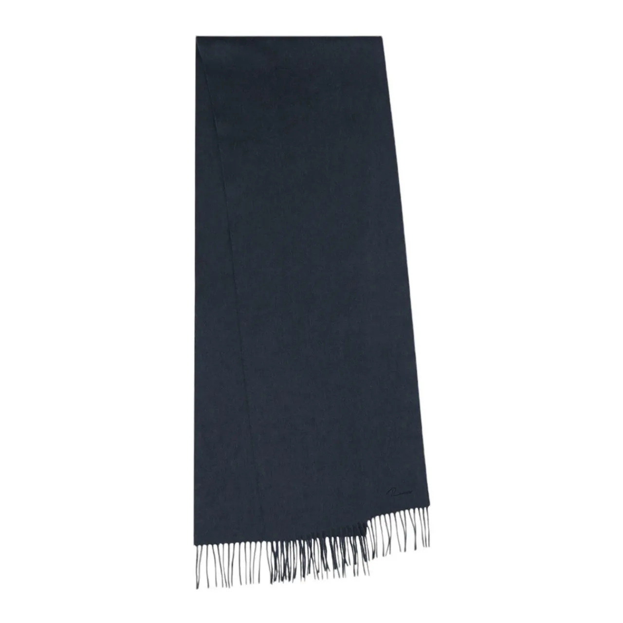 - Wool-cashmere blend, fringed trim, embroidered branding