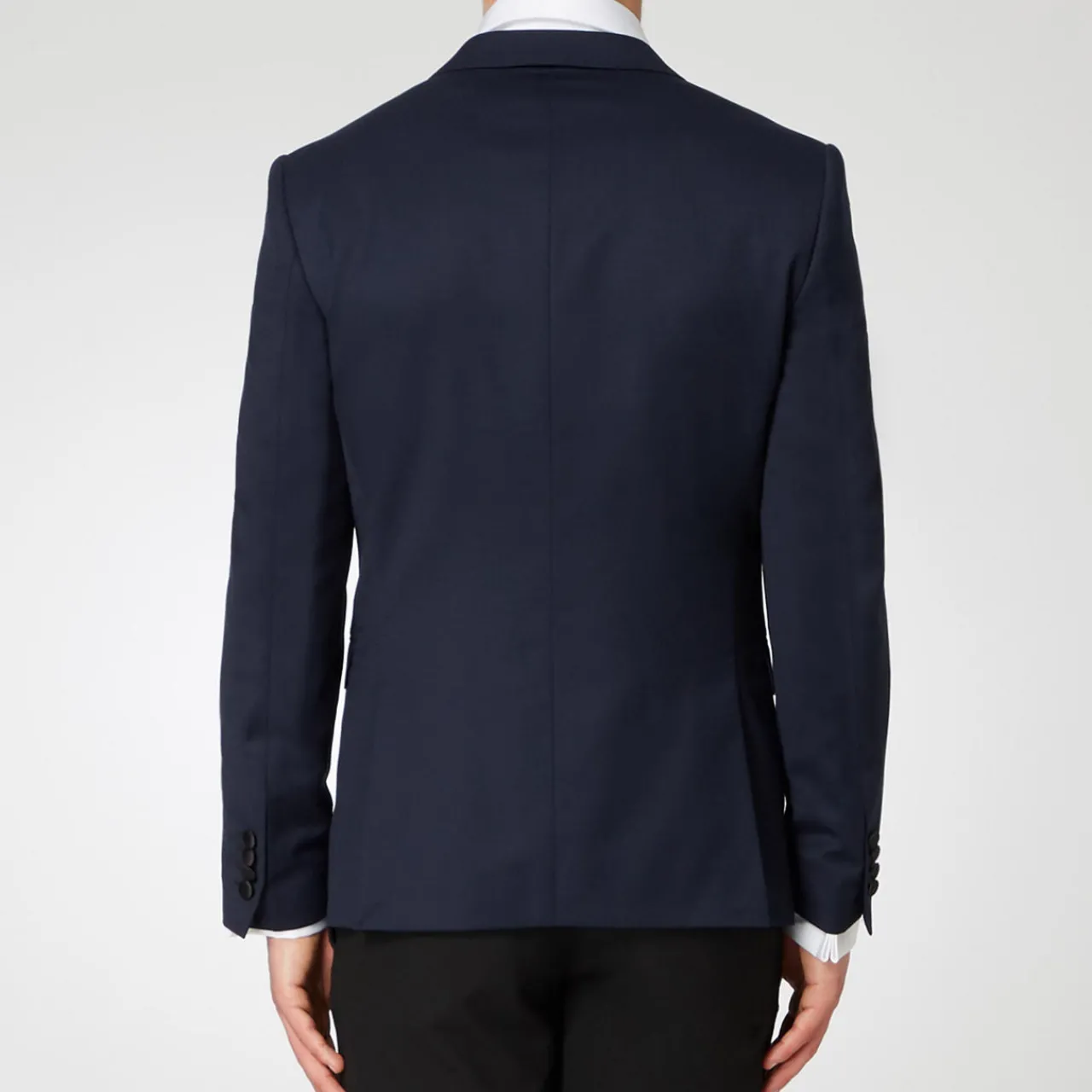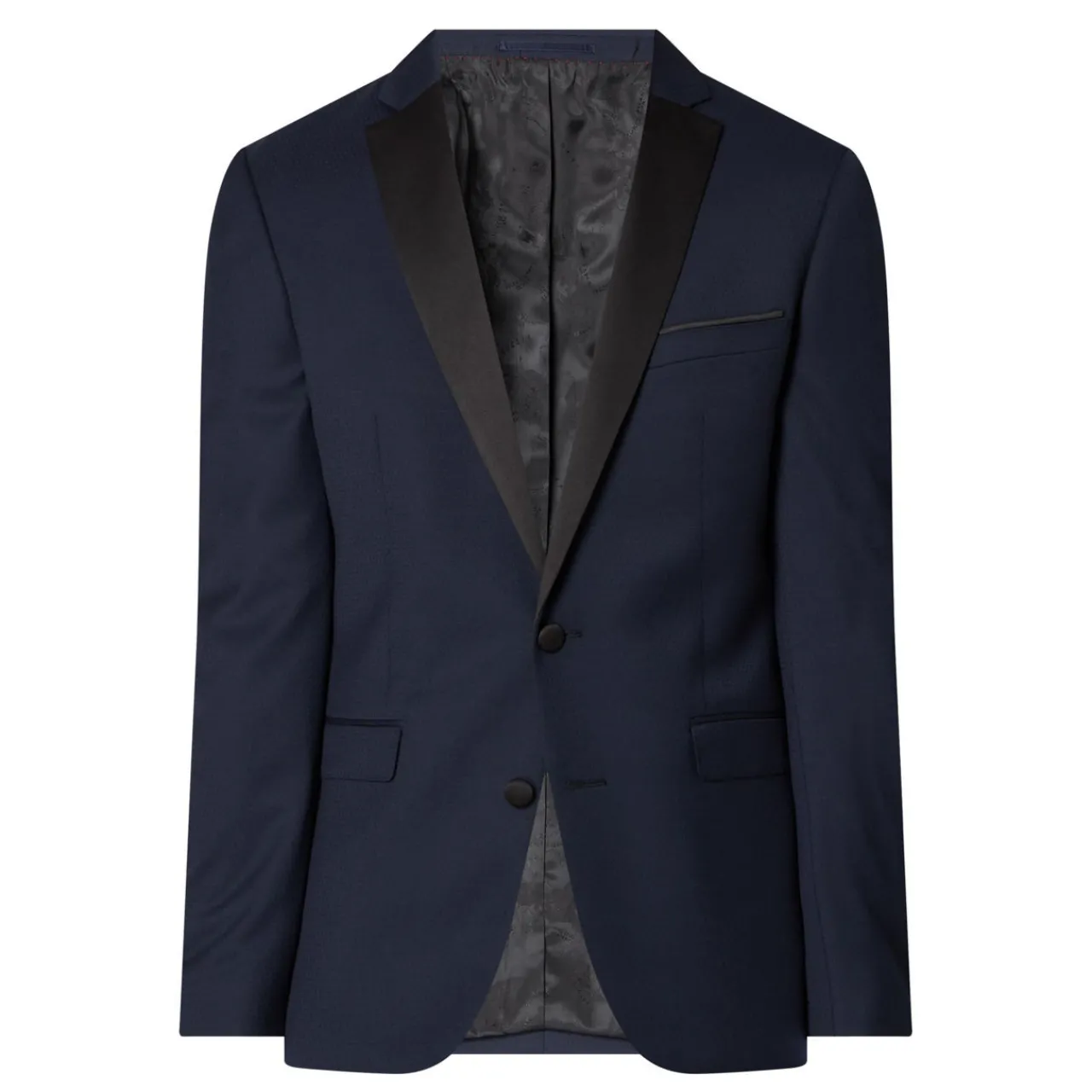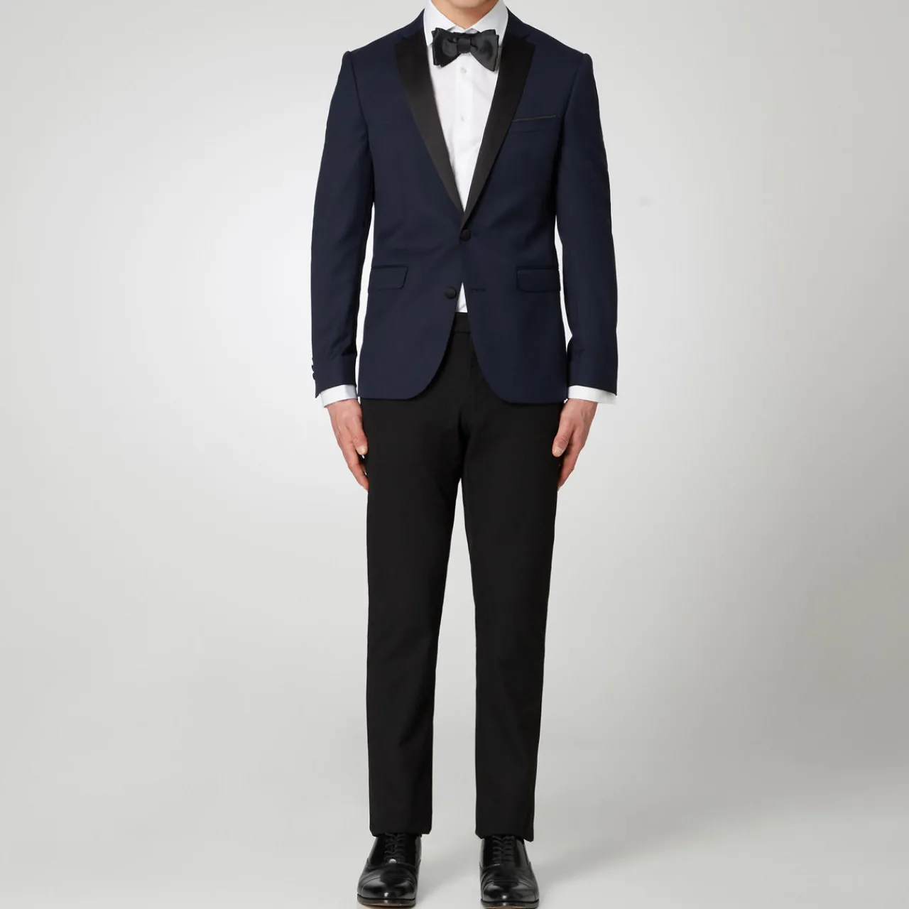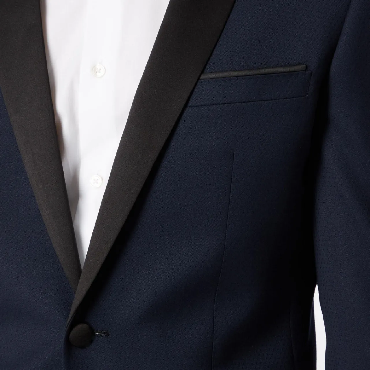 - Satin notched lapels, single-breasted, flap pockets, slim fit.