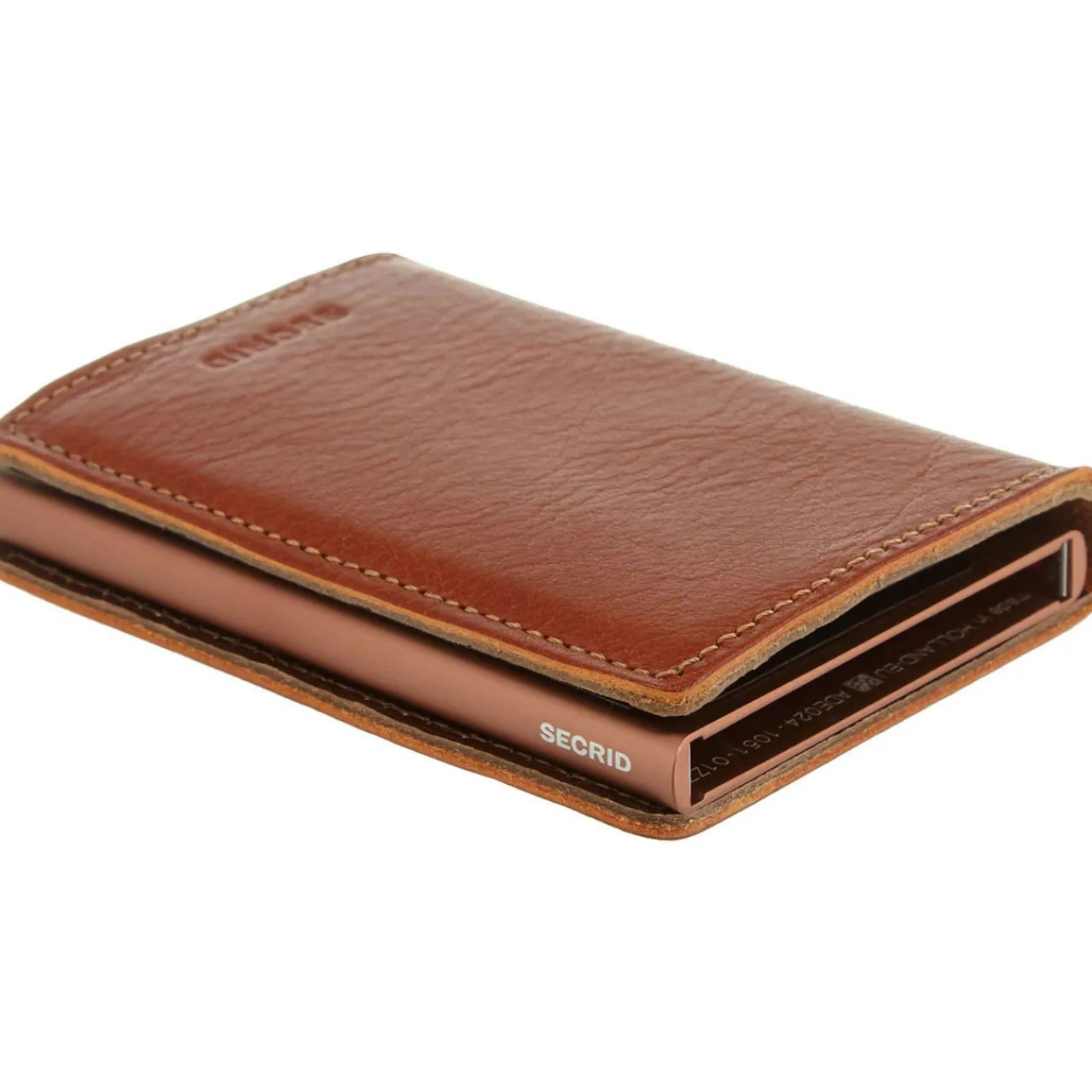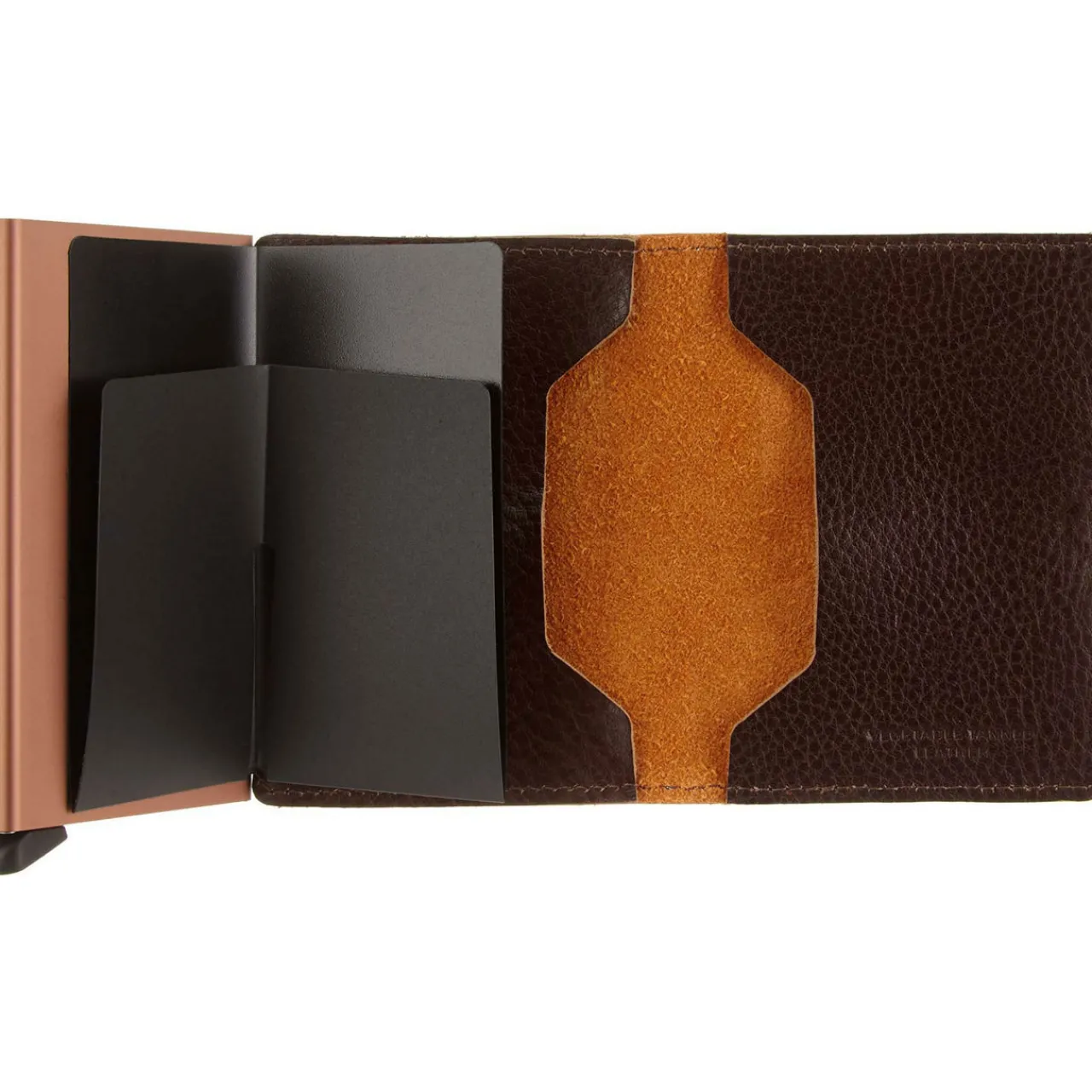 - Cash slot, magnetic clasp closure, two side card slots, aluminium case, slide mechanism, slim, suede lining